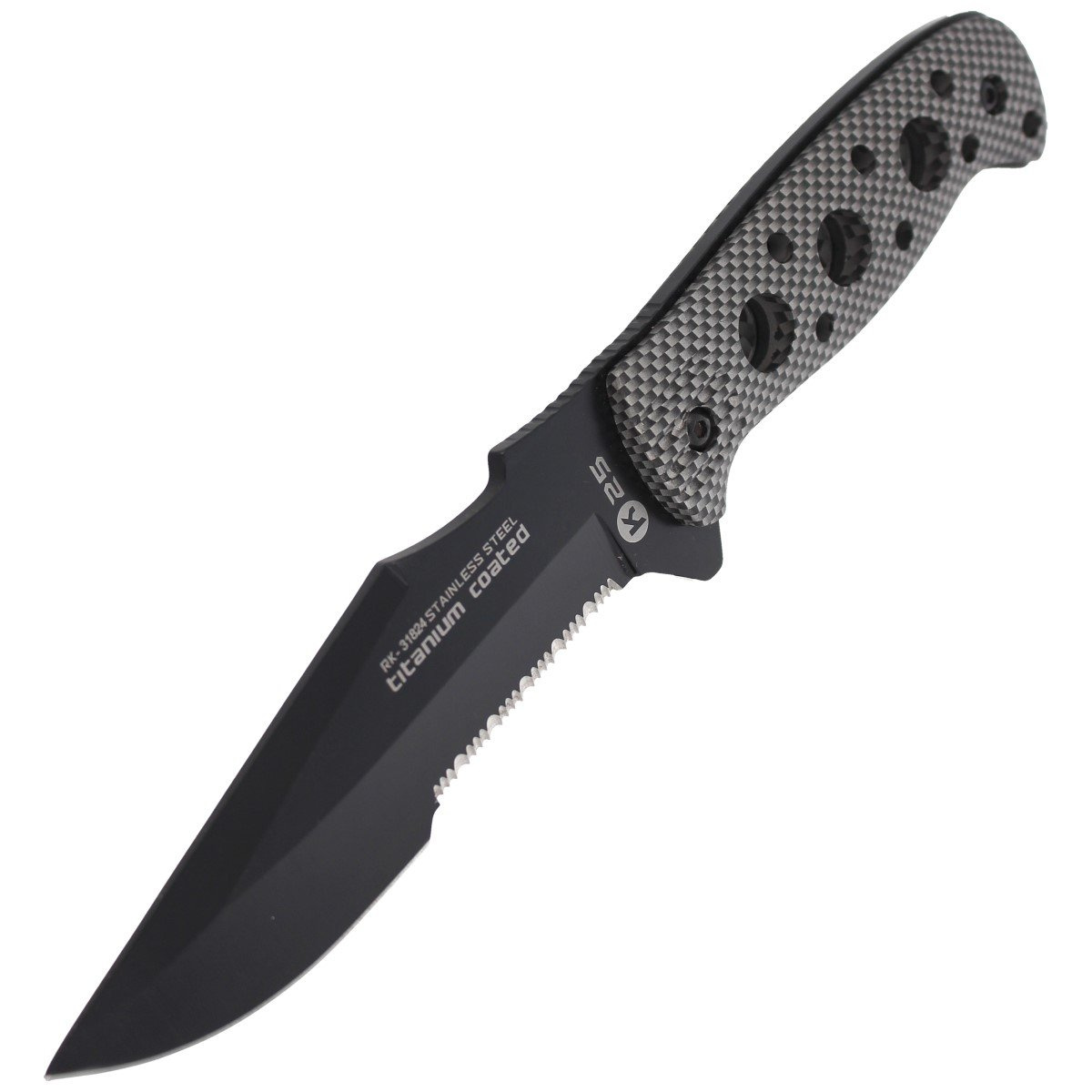 K25 / RUI CARBON FIBER Titanium Tactical tactical survival knife with a fixed blade, full tang construction, 440 steel, with carbon fiber claddings.
