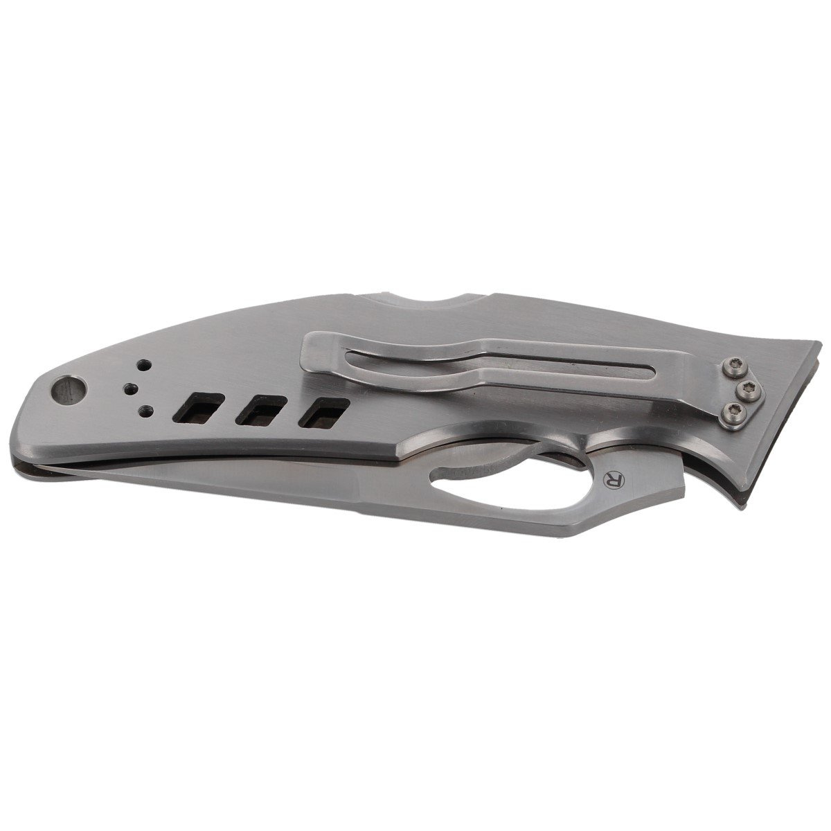 Handle - solid claddings are made of Stainless Steel. Ergonomic shape provides comfortable and secure grip also with gloves. The holes in the covers allow air to dry a wet, moist blade faster. The pocket knife is equipped with a right-hand metal clip with the possibility of fixing in two planes (Right Tip-up / Tip-down). At the back part of the handle was placed a gap (lanyard hole) enables the attachment of a security rope.