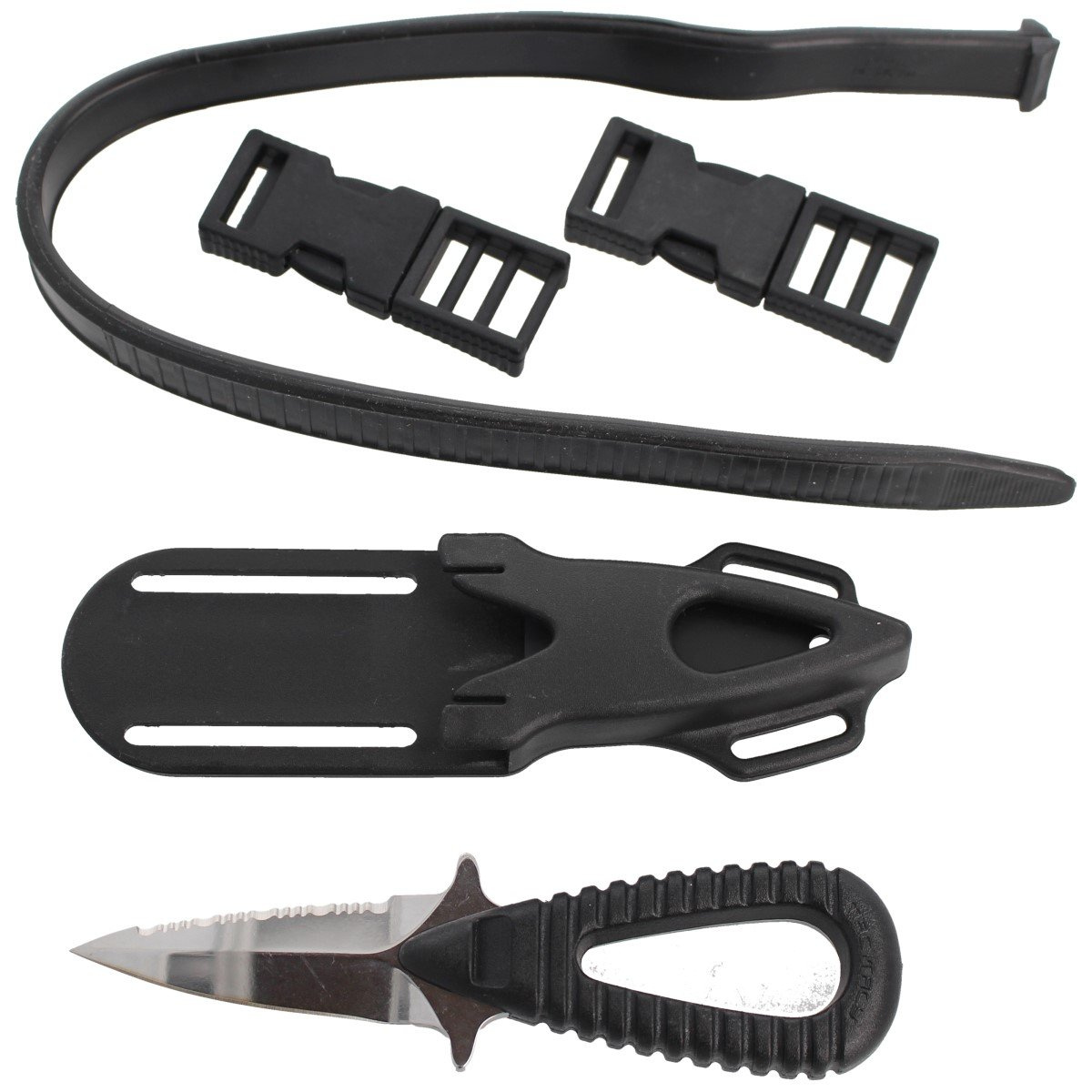 Sheath - made of hard PP polymer with holes for drainage of water, moisture. The holster is equipped with a latch to prevent the knife from slipping out in water. The sheath comes with two rubber straps and 2 plastic buckles for attaching the case to the hand, leg or to a vest.