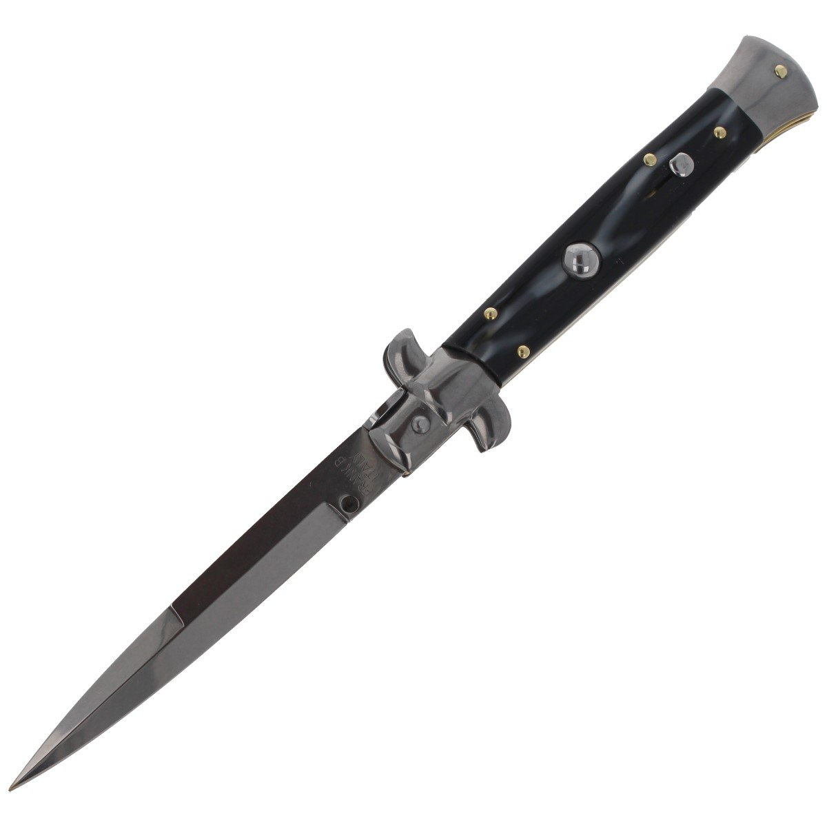 - Frank Beltrame Stiletto Imit. Horn Bayonet 23cm. The iconic Italian spring knife with hand-folded linings imitating buffalo horn. Folder when opening the blade hundredths of a second gives a characteristic click that distinguishes it from...