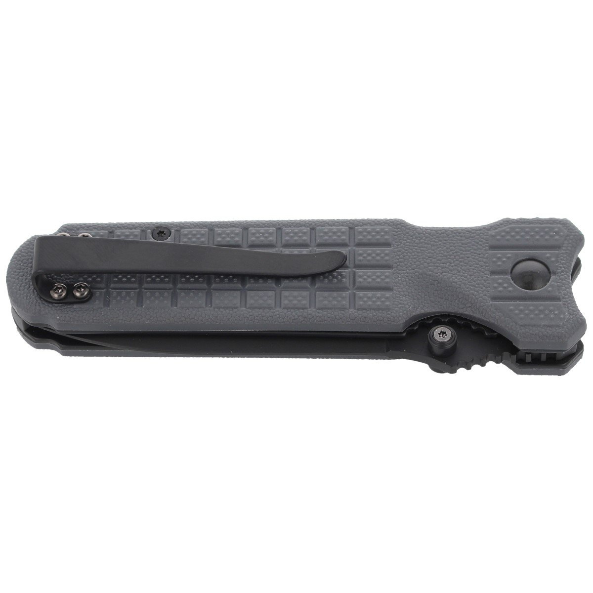Handle - in wolf gray color. Covered with non-slip, textured cladding made of FRN (Fiberglass Reinforced Nylon), glass-fiber reinforced nylon. Open-backed design simplifies cleaning. Cutouts in the linings allow intuitive access to Thumb Stud and to the mechanisms that release the blade lock. A solid left / right-handed metal clip for carrying the knife in the tip-up position.