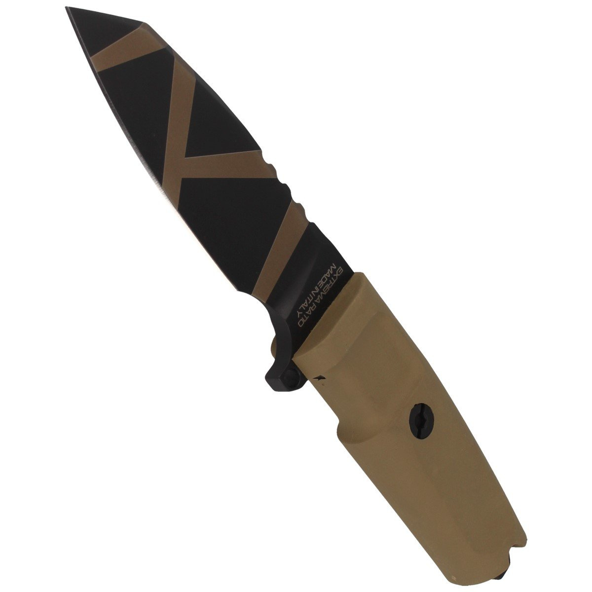 Sheath - in desert color made of hardened nylon, allows safe carrying and quick knife picking. Three options for setting the angle of transport (horizontally, vertically and diagonally at an angle of 45°). The holster is equipped with a single, automatic, pressure-activated safety device for quick gripping and cutting of the knife. Attaching the case allows it to be quickly clipped / unfastened, fits most straps with a width of 32-46 mm. In order to prevent the sheath from sliding on the belt, the handle has two adjustment screws.