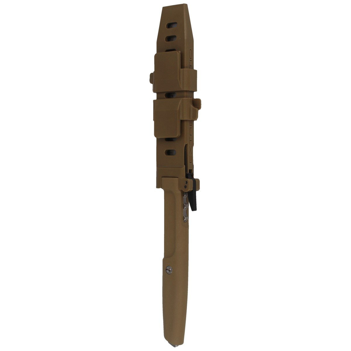 Sheath - light, made of nylon in HCS color (Hybrid Coyote Sage). The universal, openwork Aspis holster protects the knife against falling out (latch) and facilitates drying the blade. The system of two adjustable multi-position clamps enables quick attachment of the sheath to the M.O.L.L.E. system straps