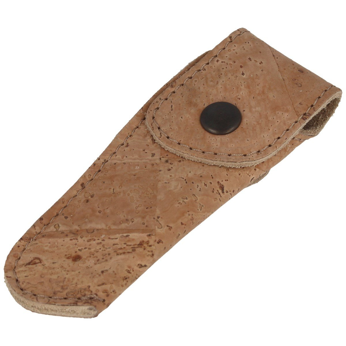 Cork Bag 125 mm, a stylish sheath designed for folding knives, made of natural cork by Portuguese brand MAM. The functional case, secured with a Prym-type snap closure, allows carrying pocket knives up to 125 mm in length. The case is covered with a 100% natural cork veneer. Reinforced along the edges with stitching for added durability. Attaches to a belt or equipoise to allow the knife to be carried in an upright position for convenient access and safe storage of the knife.