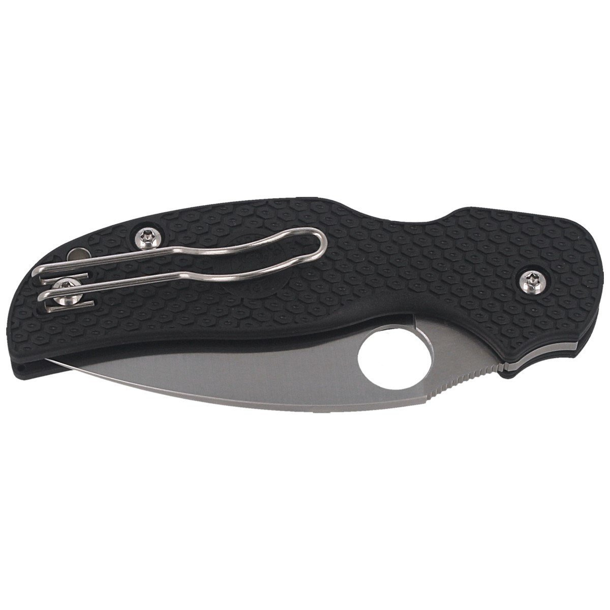 Blade - with Leaf-Shaped profile, thickness 3 mm. Plain blade has a Full Flat Grind for enhanced cutting ability. The flat grind guarantees perfect geometry of the cutting edge with a sharp tip, reduces the weight of the knife and presents a beautiful satin finish. The enlarged 14 mm SpyderHole (Spyderco patent) allows opening the knife also with wet, sweaty hands. Finger Choil, arched undercut for index finger and fluted thumb ramp on the back of the blade for efficient operation of the folder.