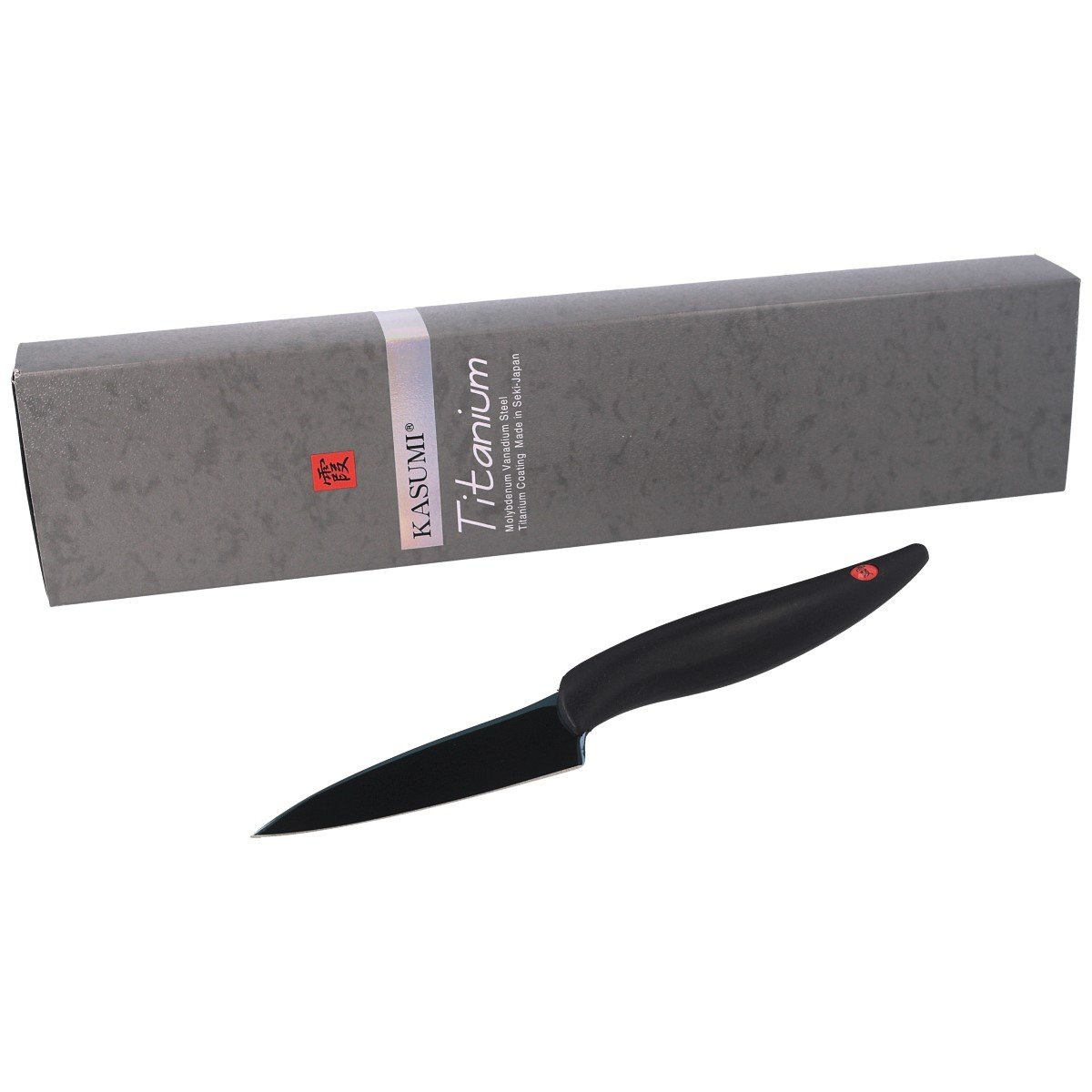 • Kasumi Blue Titanium Paring is made of Molybdenum-vanadium stainless steel, coated with a blue titanium coating. It gives the blade super abrasion resistance. Titanium is also inert, so it prevents giving food a metallic aftertaste. Note!!! Very sharp!!!