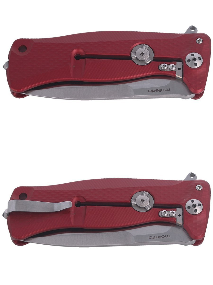Handle - fashionable red color. Made in Solid® Knife technology, obtained from a single piece of Ergal aluminum, processed in 4D. This provides a monolithic skeleton (body) of the highest strength, which is a solid structural element. The grip facings were CNC machined to obtain an anti-slip texture. Two-position left / right compact clip allows you to carry the knife in tip-up position. Bolted to the aluminum frame with a tungsten carbide screw/glass breaker. In the back of the linings lanyard hole, a hole for a cord.