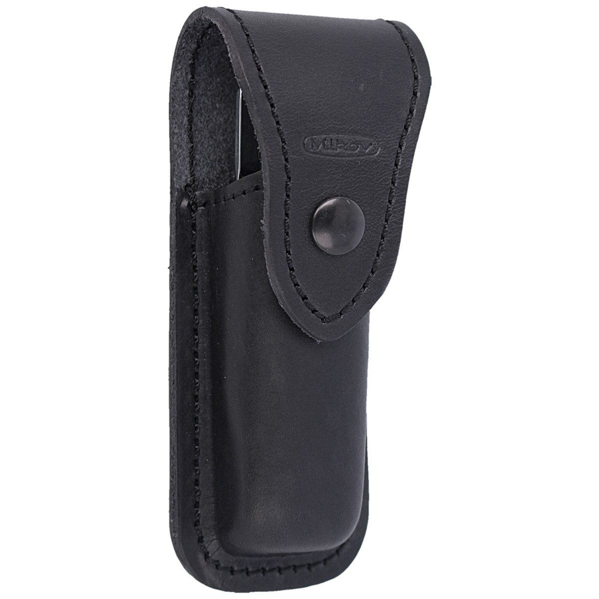 Case - with Prym snap fastener. Made of high quality genuine leather in black with embossed manufacturer's logo. The scabbard has an attachment to the belt or to the equipment allowing to carry the knife in an upright position.