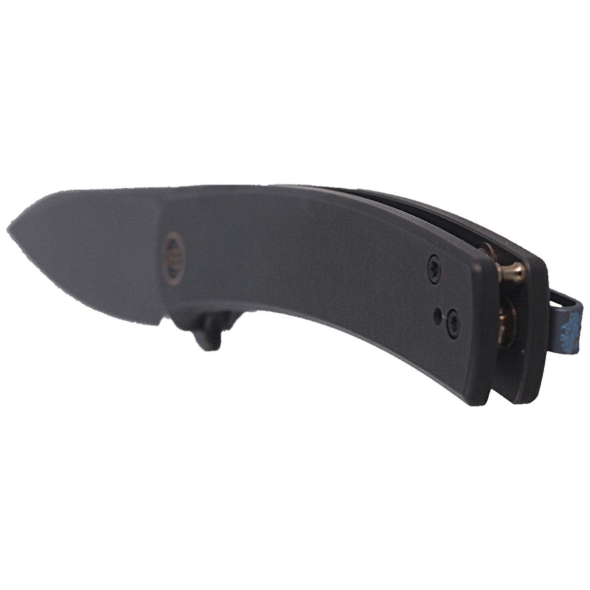 Handle - made of thick pieces of titanium, also finished in black, connected to each other by titanium spacer sleeves. The simplicity and robustness of the construction ensure many years of use. A two-position (left/right) deep carry clip, made of hammered and colour-anodised titanium, allows the knife to be carried in tip-up position. One of the sleeves serves as a pendant to thread a safety or decorative cord. As in other models, the pivot is decorated with a stylised manufacturer's logo.
