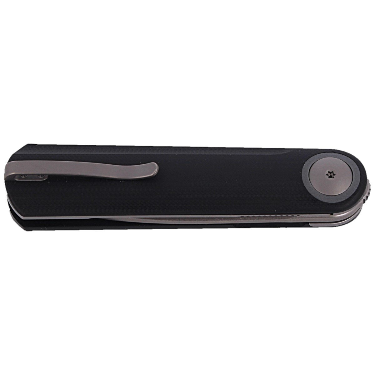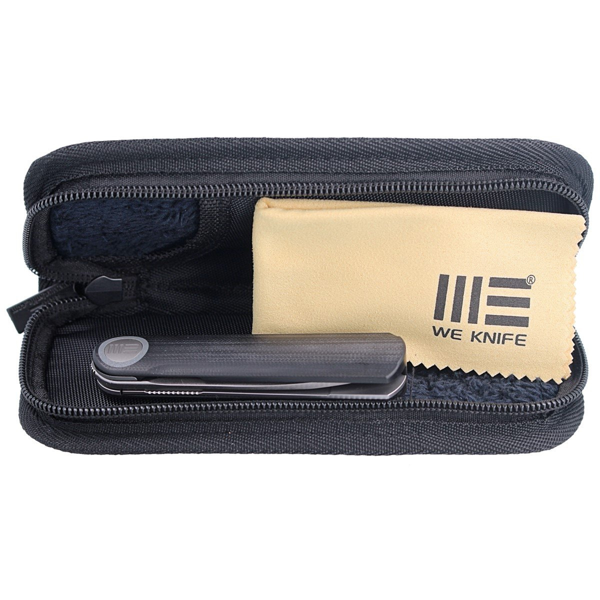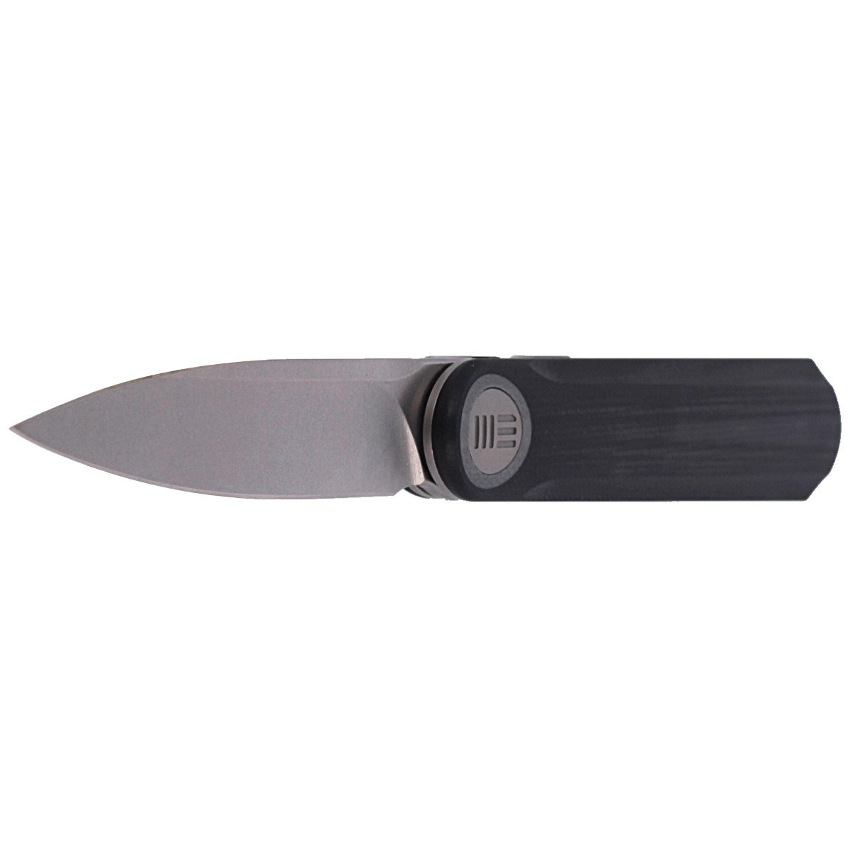 Handle - monolithic, made of a single piece of black G10, milled with CNC 3D machine tools. This provides unbelievable strength but requires the highest skills and precision in production. The pivot axis is decorated with a stylized WE brand logo. Right-side, one-position titanium deep carry clip allows you to carry the knife discreetly in your pocket in tip-up position.