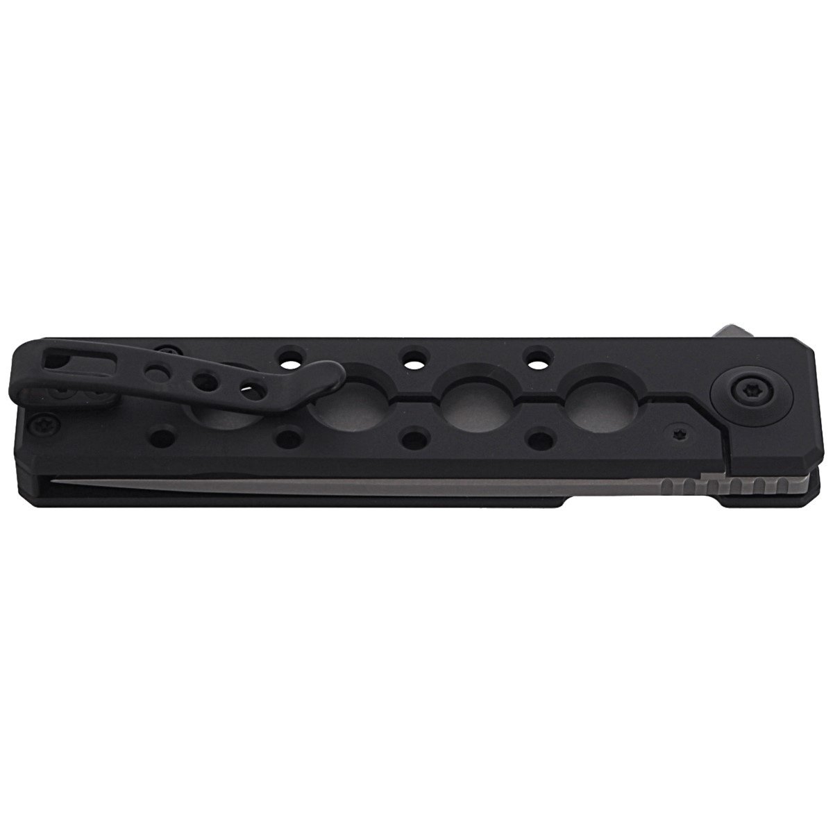 Handle - thick pieces of blackened solid titanium in which several holes were made to reduce weight. For contrast, the holes were finished with satin finish. The facings have been screwed to the titanium backspacer. The simplicity and solidity of the design give confidence in many years of use. A deep-carry, single-position (right side) clip made of titanium allows the knife to be carried in tip-up position. Above the clip is a lanyard hole, which is a hole for threading a safety or decorative cord. As in other models, the pivot is decorated with a stylized manufacturer's logo.