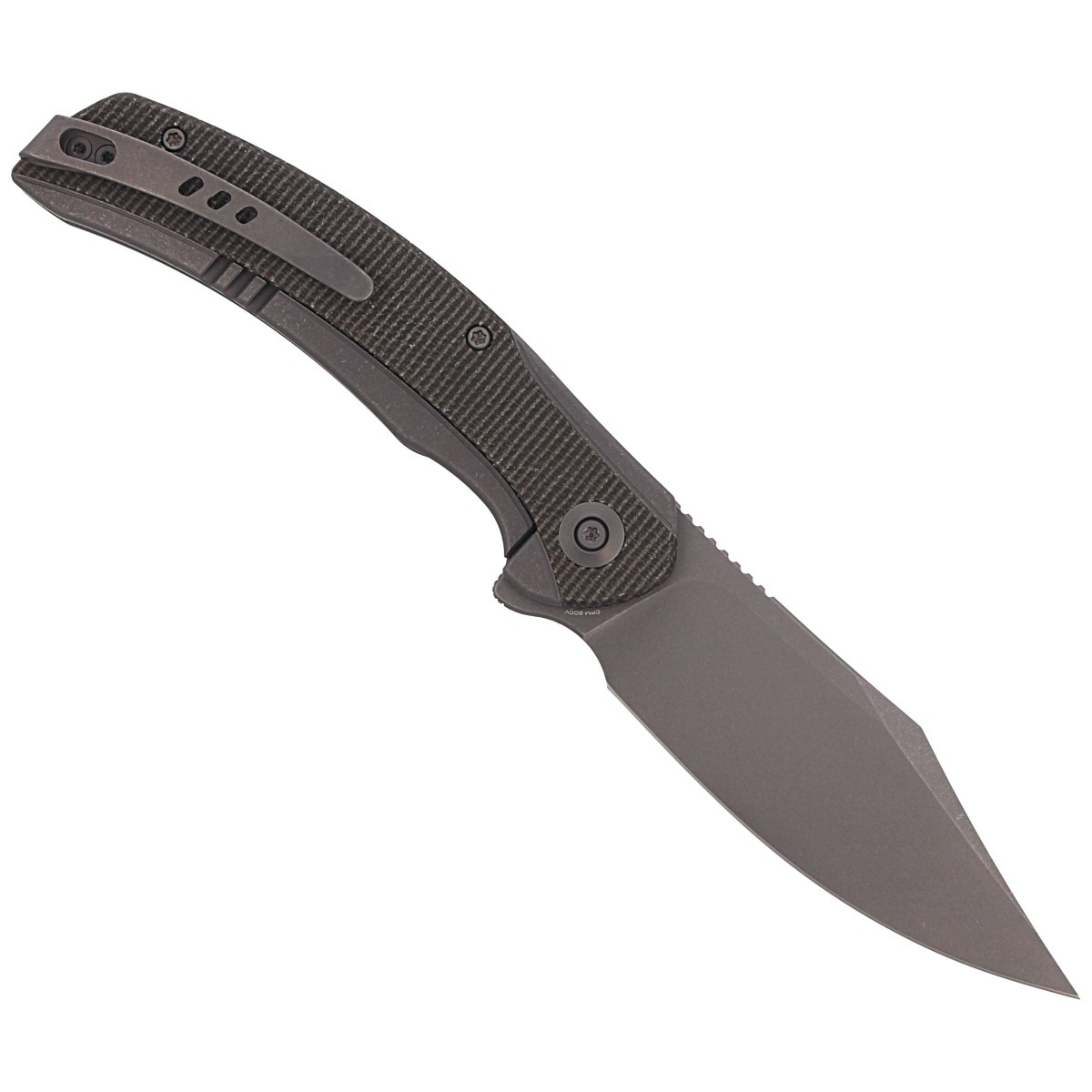 Handle - made of 6AL4V titanium and inserts of green Micarta (practically indestructible material made of linen or cotton pressed under pressure with synthetic resin) for better grip. Chamfered cover edges eliminate sharp edges for a comfortable and secure grip. Open-backed design mounted with titanium spacer sleeves reduces weight and facilitates cleaning. The pivot is adorned with a stylized WE Knife brand logo. Two-position (right/left) titanium deep carry clip allows you to carry the knife discreetly in your pocket in tip-up position. Additionally, a second clip with a set of mounting screws is included to fit the left side of the knife.