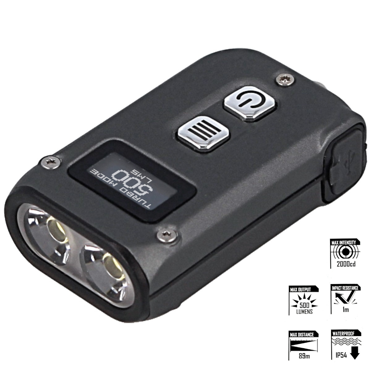 - TINI2 Gray compact flashlight by NiteCore capable of producing an impressive amount of light. Essential for situations where an additional light source is required. Built-in Li-Ion rechargeable battery charges easily with a USB-C cable. Five light modes.