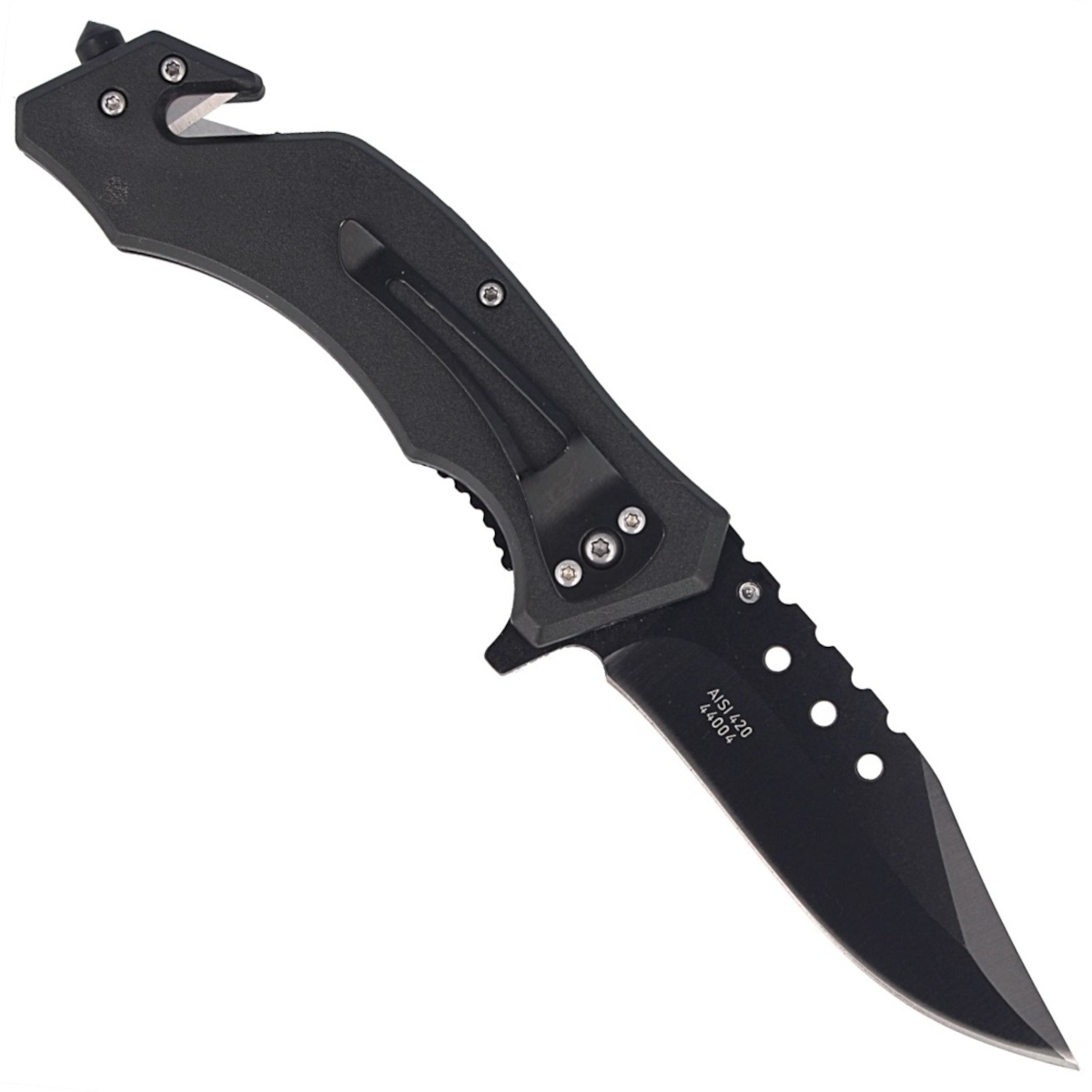 Handle - black plastic facings mounted to a steel frame. The left side decorated with a graphic motif of the US flag. Chamfered edges of the facings eliminate sharp edges for comfort and sure grip. A single-position (right/left) metal deep-carry clip allows you to carry the knife discreetly in your pocket in a tip-down position (blade tip down). The back of the handle features a belt cutter and a tungsten-carbide glass breaker.