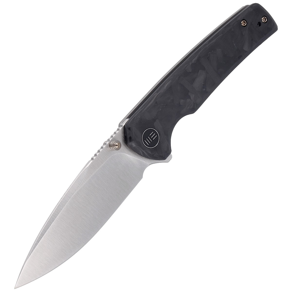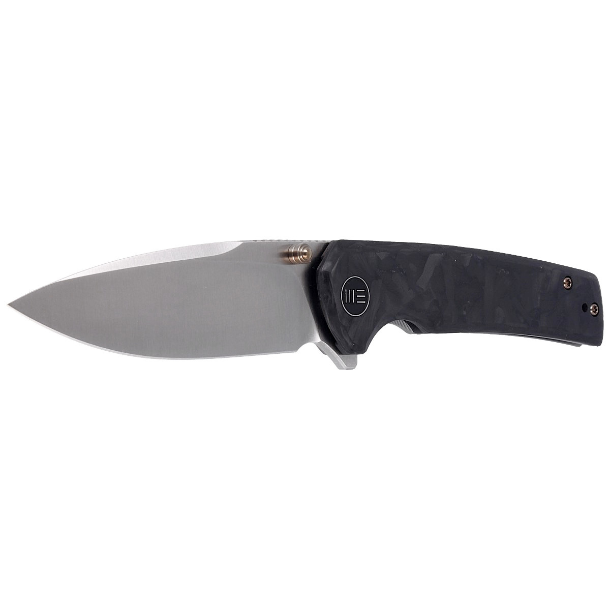 Handle - presentation side is made of Marble Carbon Fiber, the lock side is made of 6AL4V titanium, in the lock area the hollow is slightly textured for more secure finger rest. Chamfered cover edges eliminate sharp edges and fore finger groove improves grip. Open-backed construction mounted with titanium spacer sleeves reduces weight and facilitates cleaning. Pivot is decorated with stylized WE Knife brand logo. Two-position (right/left) titanium deep carry clip allows you to carry the knife discreetly in your pocket in tip-up position. Bolts, pivot and peg in the blade in a contrasting gold finish to the handle.
