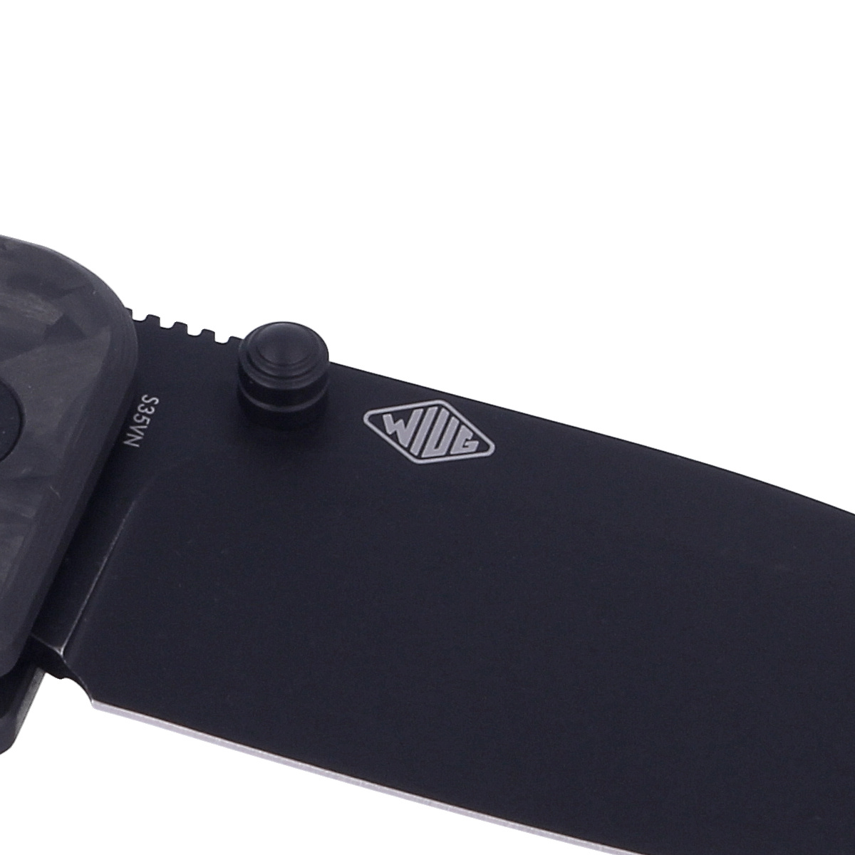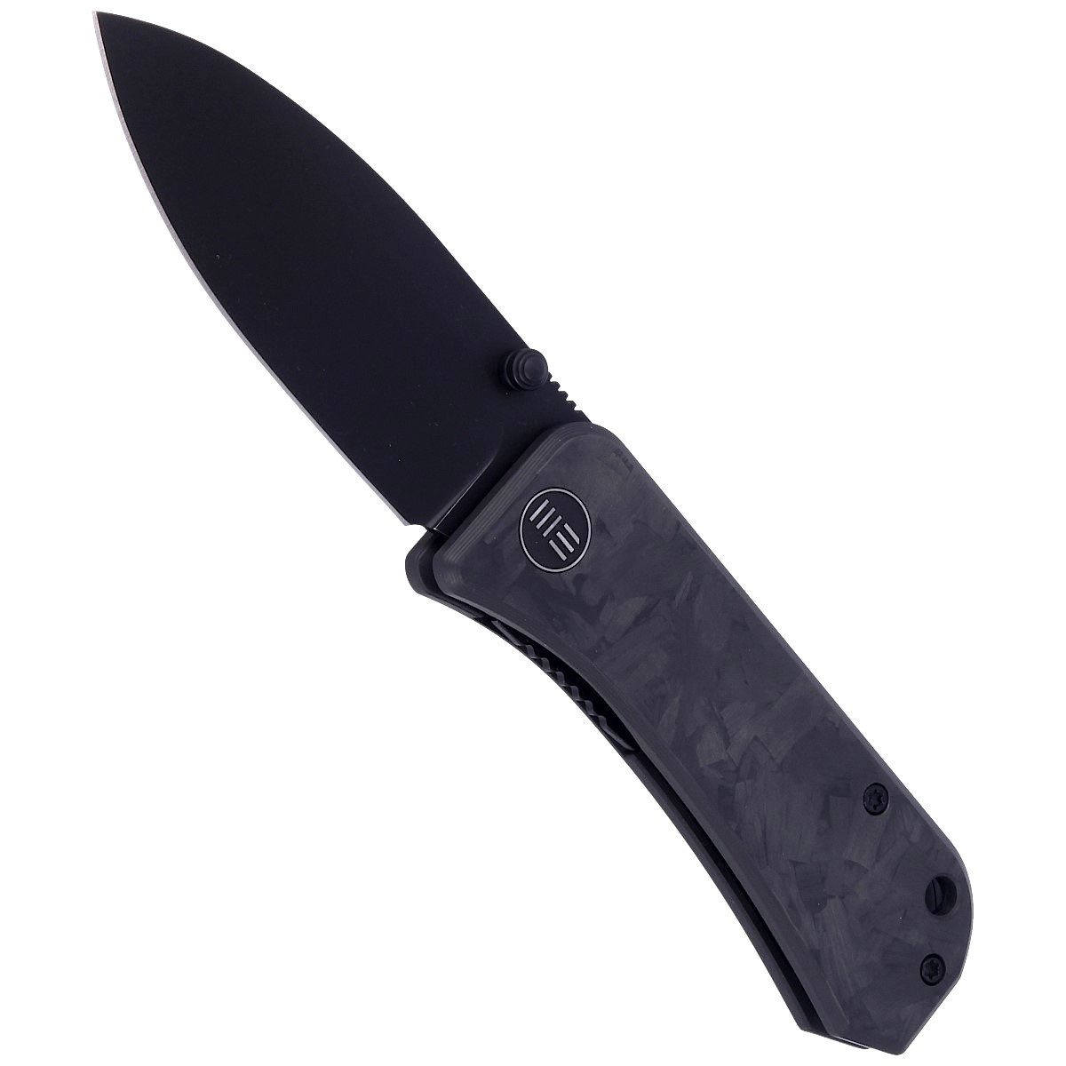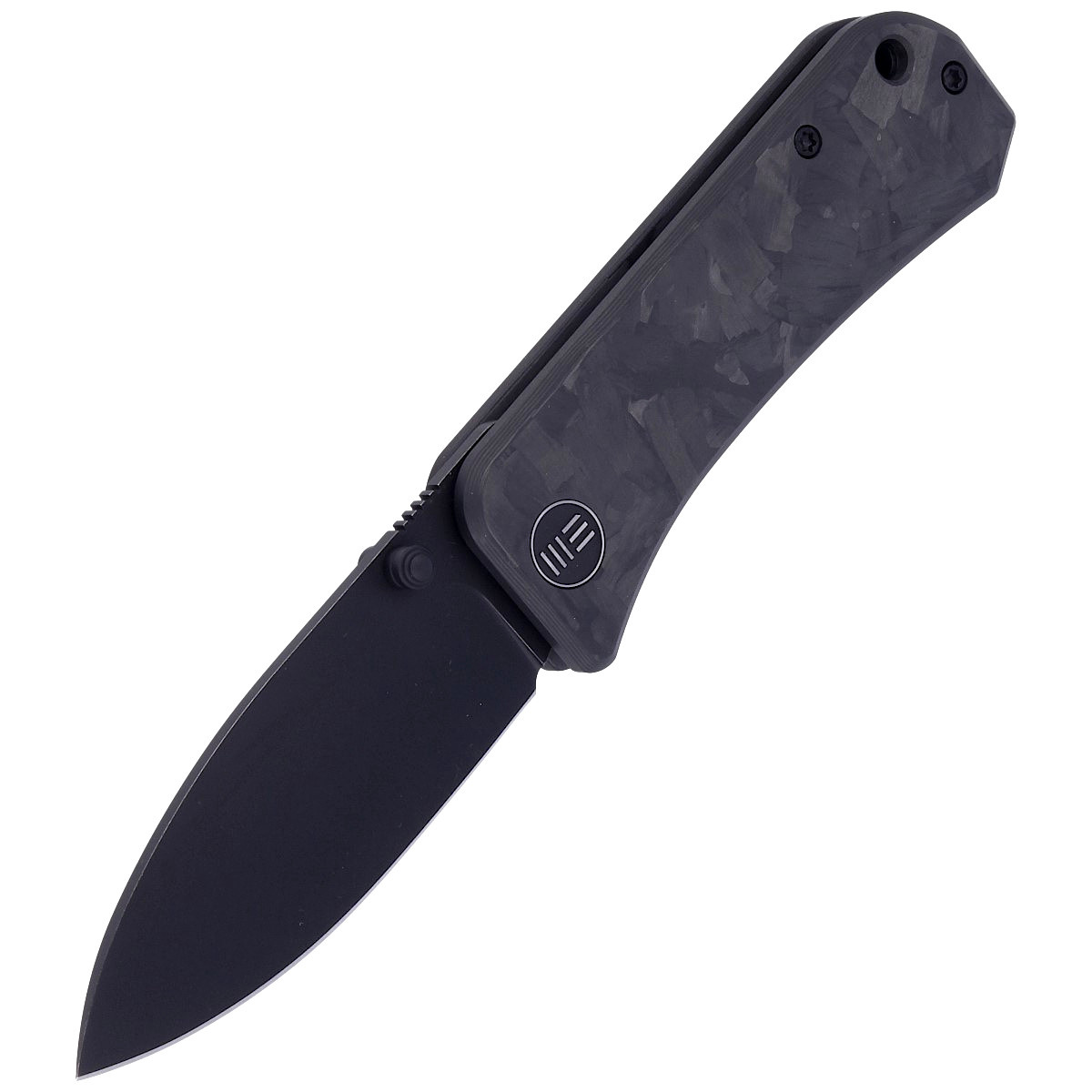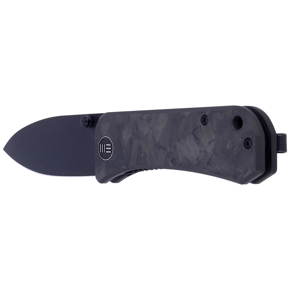 Handle - presentation side made of Marble Carbon Fiber, lock side made of 6AL4V titanium. Open-backed design attached to each other with steel spacer sleeves reduces weight and facilitates cleaning. The pivot is decorated with a stylized WE brand logo. Right-side, one-position metal deep carry clip allows you to carry the knife discreetly in your pocket in tip-up position. Lanyard hole on back of handle for cord.