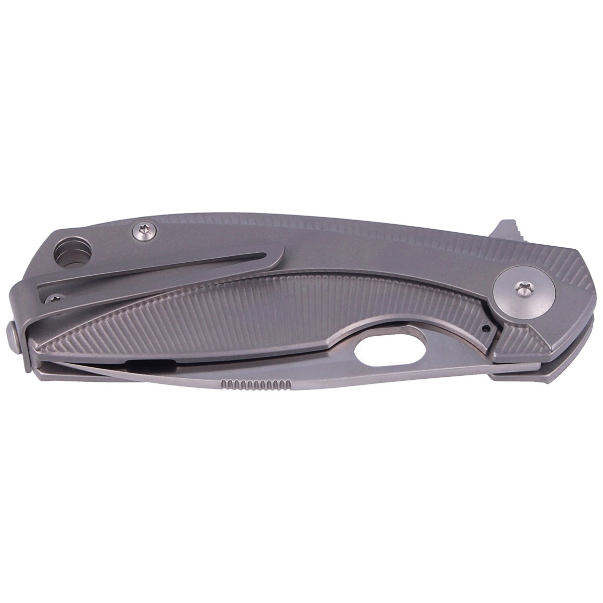 Handle - made of solid titanium was covered with matte Bead Blasted finish. On this an additional titanium "tie" was applied. Facings were screwed to the CNC milled titanium backspacer, which means practically indestructible construction. Backspacer and decorative ring around the pivot collar are made of titanium. Right-side, one-position titanium deep carry clip allows you to carry the knife discreetly in tip-up position. At the end of the handle lanyard hole, a hole for a cord.