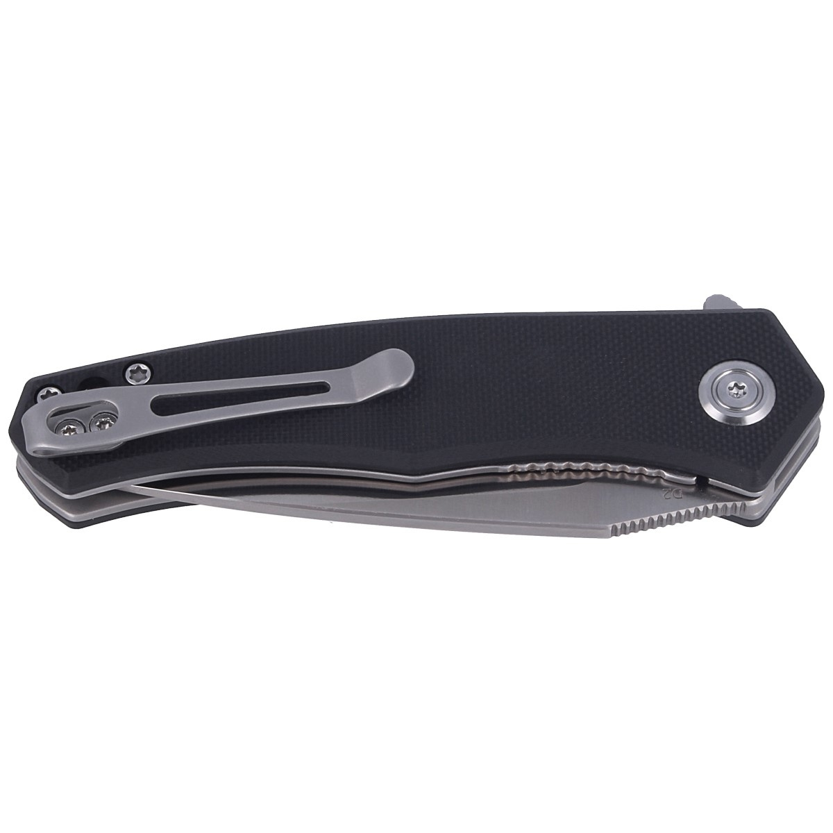 Handle - black G10 (pressure-pressed fiberglass with synthetic resin) facings, textured to improve grip confidence, bolted to the knife's steel frame. The so-called open-backed design without the typical backspacer, fastened together with steel spacers for easy cleaning. The simple, sturdy design gives assurance of many years of use. Deep finger undercut (fore finger groove) improves grip security. A two-position (right/left) steel deep carry clip allows you to carry the knife discreetly in your pocket in tip-up (blade tip up) position. Above the clip a lanyard hole, a hole for threading a safety or decorative cord.
