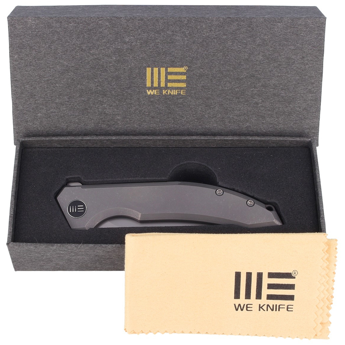 Made of 6AL4V titanium, chamfered cover edges eliminate sharp edges and fore finger groove improves grip security. The facings are screwed to an intricately machined titanium backspacer, giving assurance of many years of use. The pivot is decorated with stylized WE Knife brand logo. The single position (right) titanium deep carry clip allows you to carry the knife discreetly in your pocket in tip-up position. Above the clip lanyard hole, a hole for threading a safety or decorative cord.