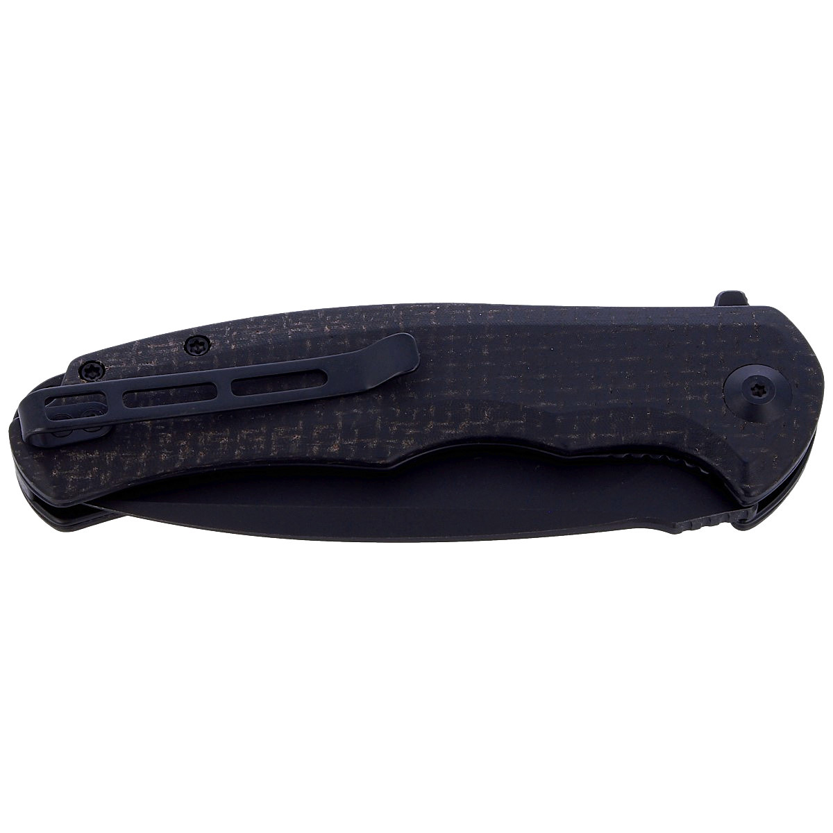 Handle - rough liners made of black micarta (compressed canvas with synthetic resin), which were screwed to steel liners. In practice this means many years of work without weakening the construction. Two-position, left- and right-handed deep carry clip allows you to carry the knife in tip-up position. Above the clip there is a lanyard hole for safety or decorative cord.