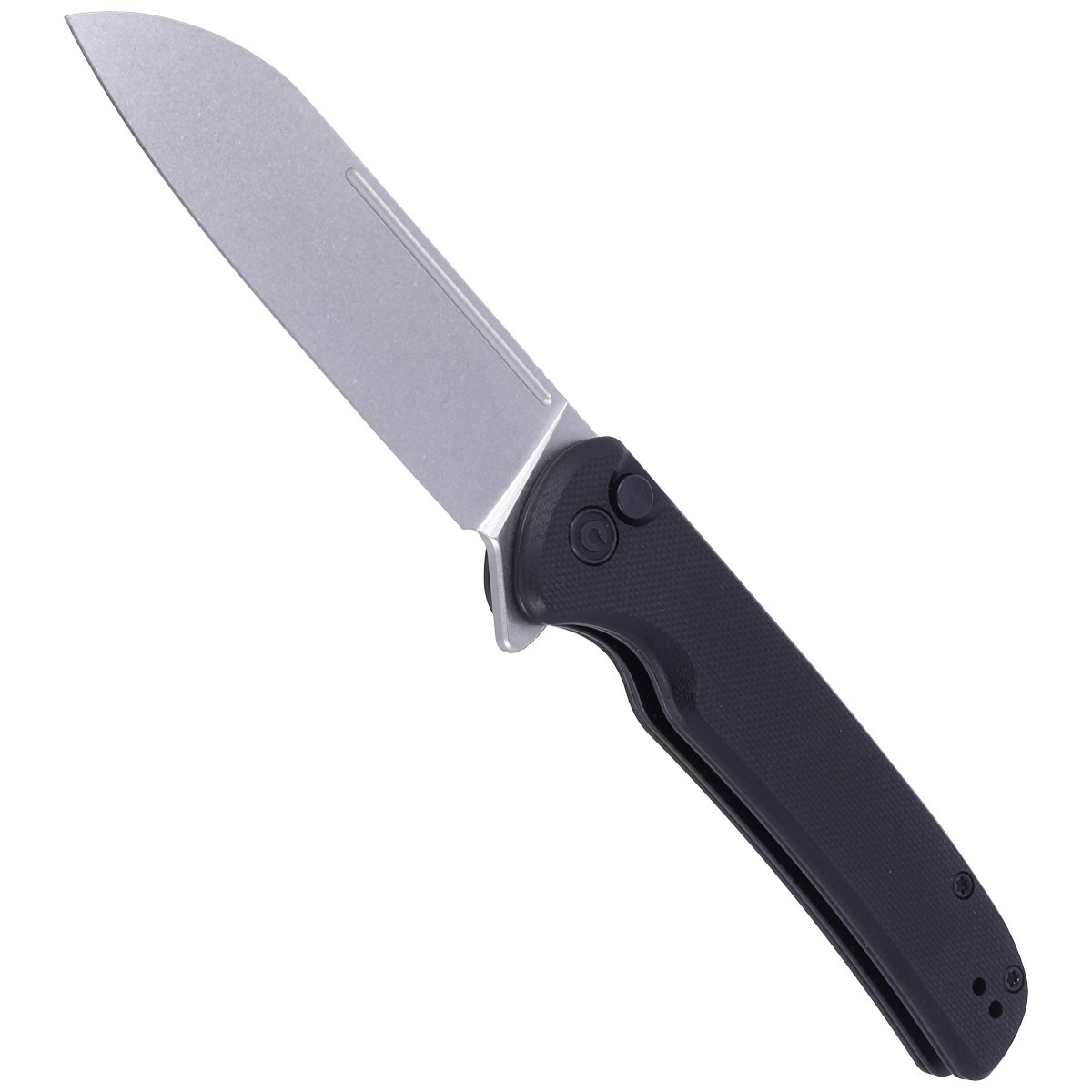 Black G10 (compression-moulded fibreglass with synthetic resin) textured grip for better grip. Open-backed design secured to each other with steel spacers reduces weight and makes cleaning easier. Simple, solid construction gives assurance of many years of use. The pivot is decorated with a stylized Civivi brand logo. Metal double sided deep carry clip allows you to carry the knife discreetly in your pocket in tip-up position.