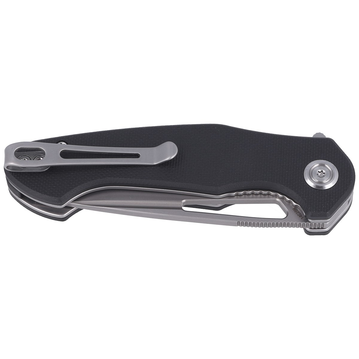 Handle - black G10 (pressure-pressed fiberglass with synthetic resin) facings,textured to improve grip security, bolted to the knife's steel frame. The whole bolted to a solid backspacer, also made of G10. The simple, sturdy design gives you the assurance of many years of use. A deep finger undercut (fore finger groove) improves grip security. The pivot axis is decorated with a screw with a stylized manufacturer's logo. A two-position (right and left) metal deep-carry clip allows you to carry the knife discreetly in your pocket in tip-up (blade tip up) position. The backspacer conceals a place for threading a safety or decorative cord.
