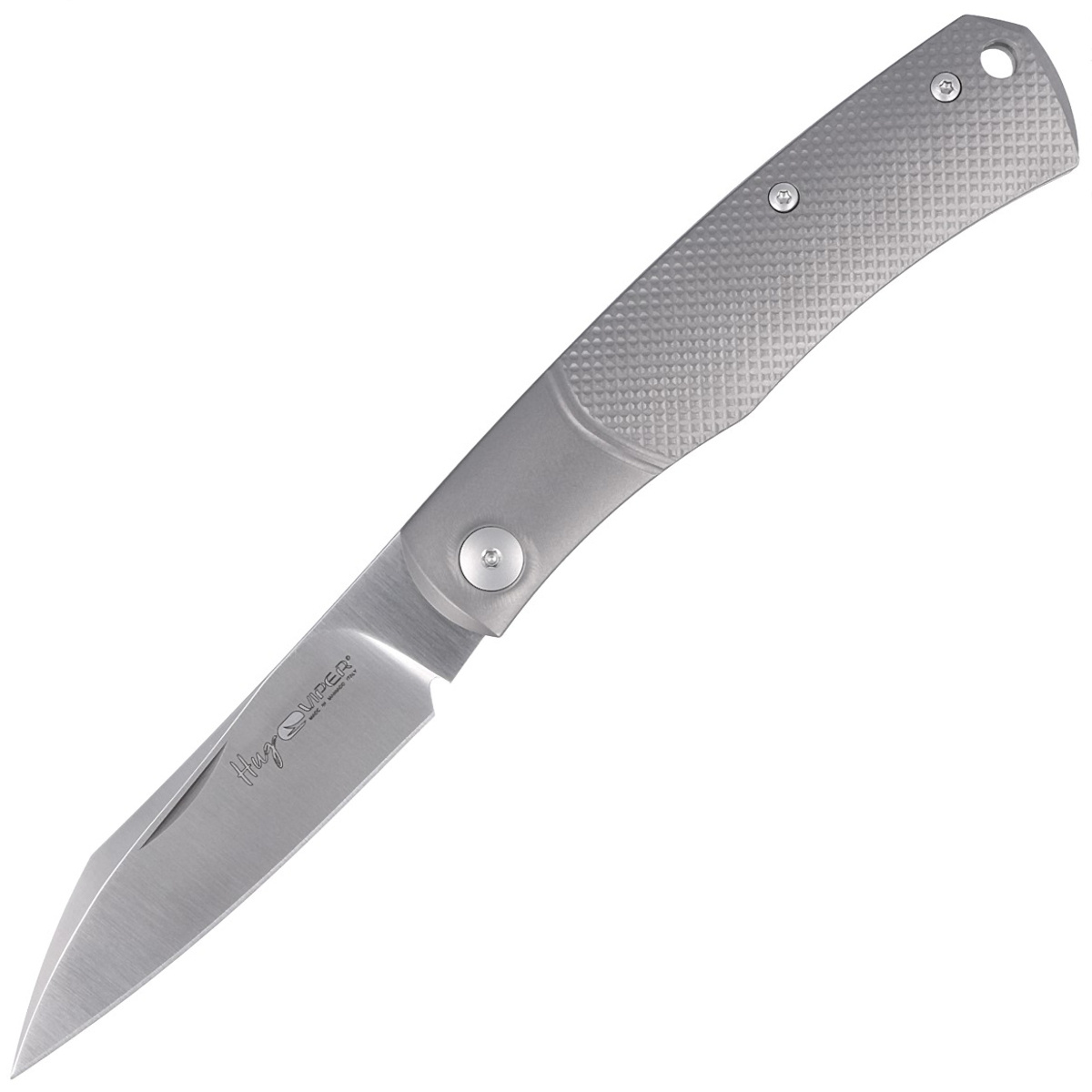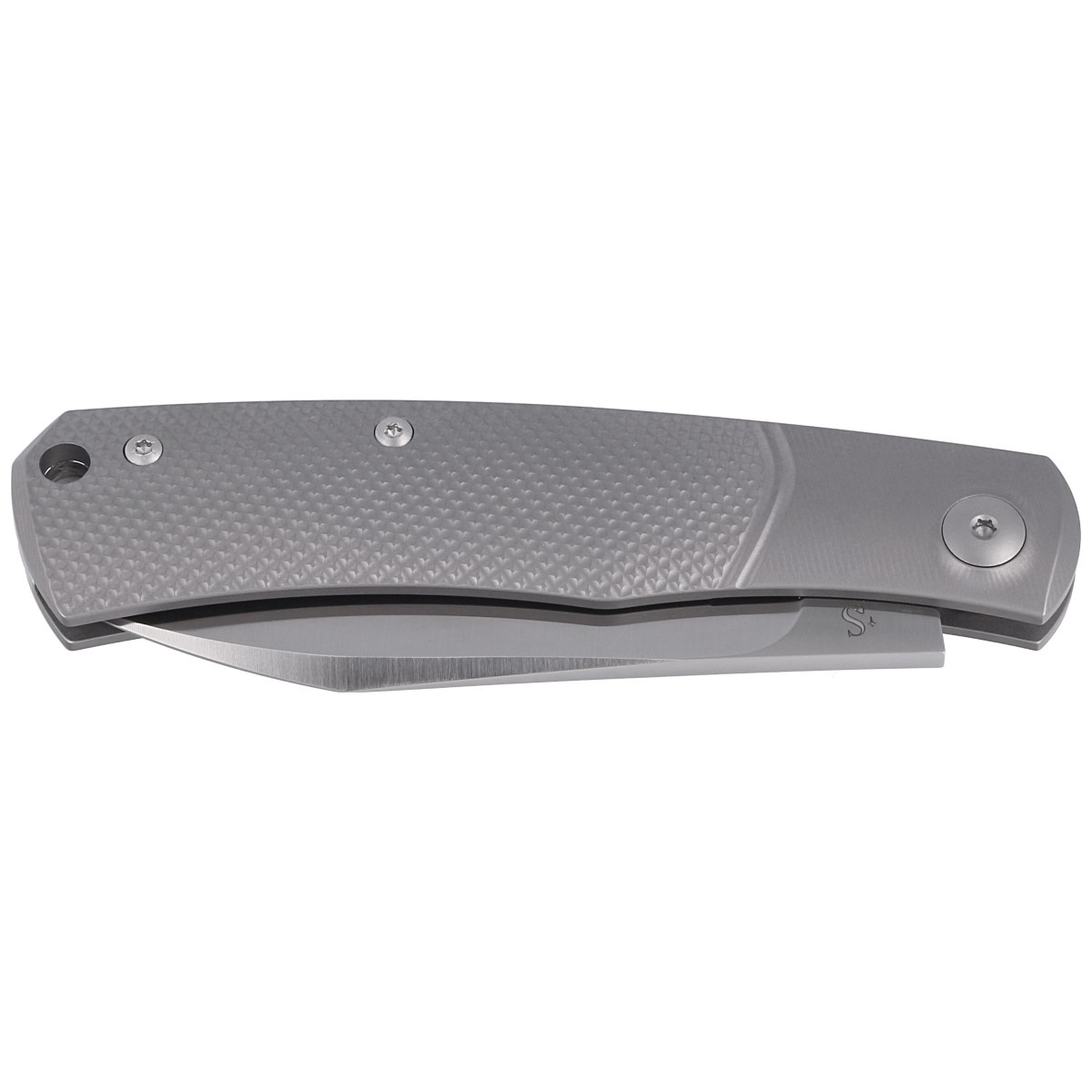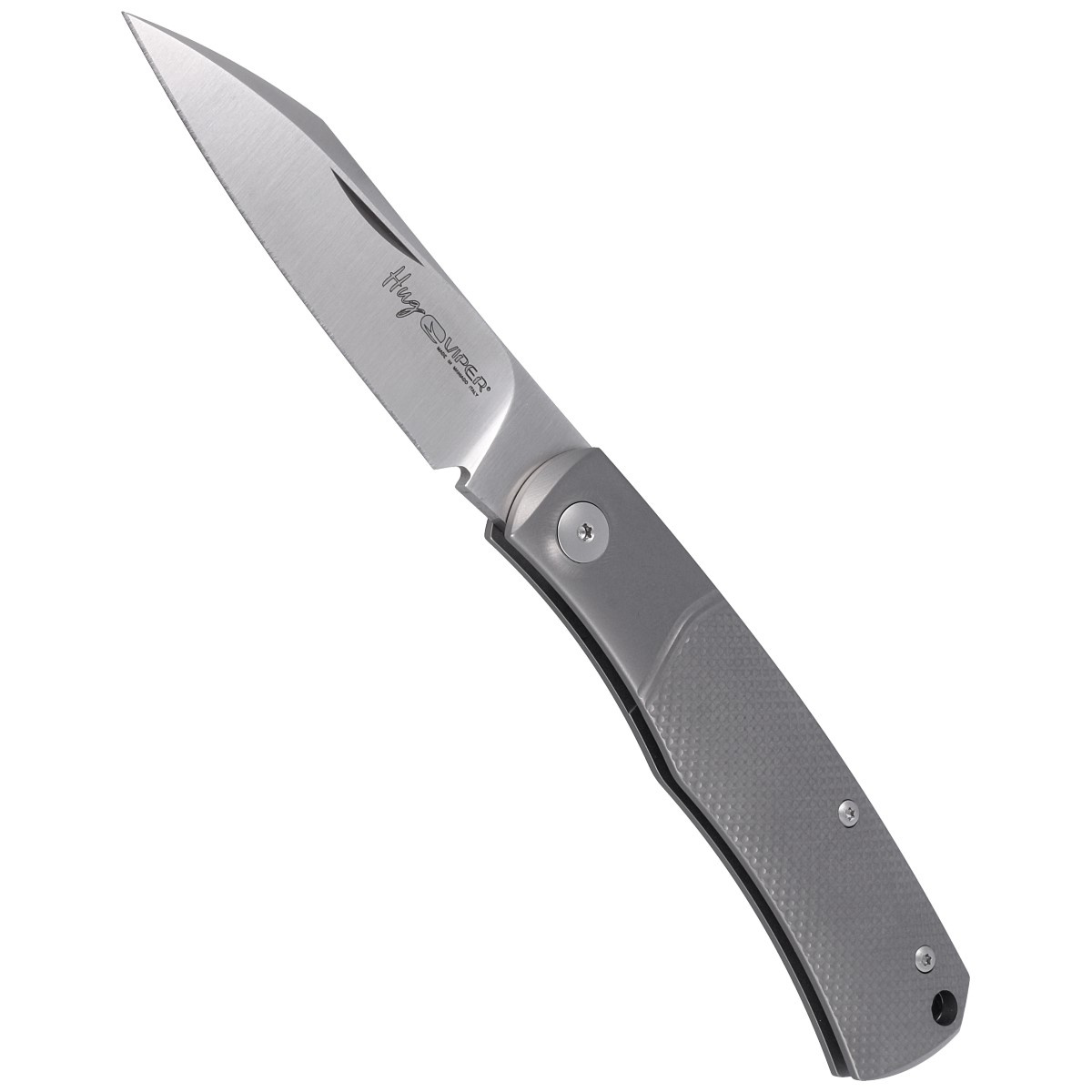 - Hug Gray Titanium, Satin lightweight folder equipped with SlipJoint mechanism. Design by French custom knife maker Sacha Thiel. Slim geometrically textured handles and modified Wharncliffe blade for an aggressive look and functionality