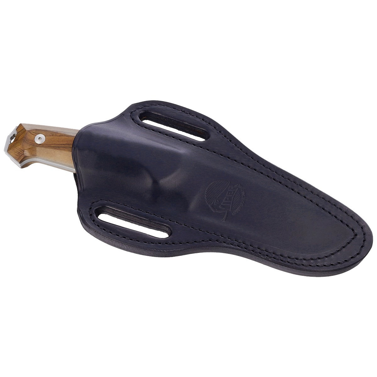 Sheath - extended, protecting the blade along with part of the handle. Hand-stitched, made of natural leather in black color with embossed manufacturer's logo. The edge of the case is stitched with decorative thread. Attached to the belt, it allows carrying the knife in an upright position.