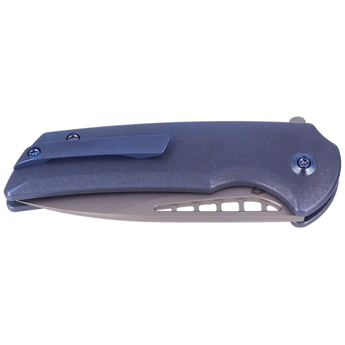 Handle - made of titanium 6AL4V, beveled edges of the covers eliminate sharp edges. Open-backed design - fixed with titanium spacer sleeves - reduces weight and facilitates cleaning. The pivot axis is decorated with a stylized WE Knife brand logo. A single-position (right) titanium deep-carry clip allows you to carry the knife discreetly in your pocket in tip-up position (blade tip up).