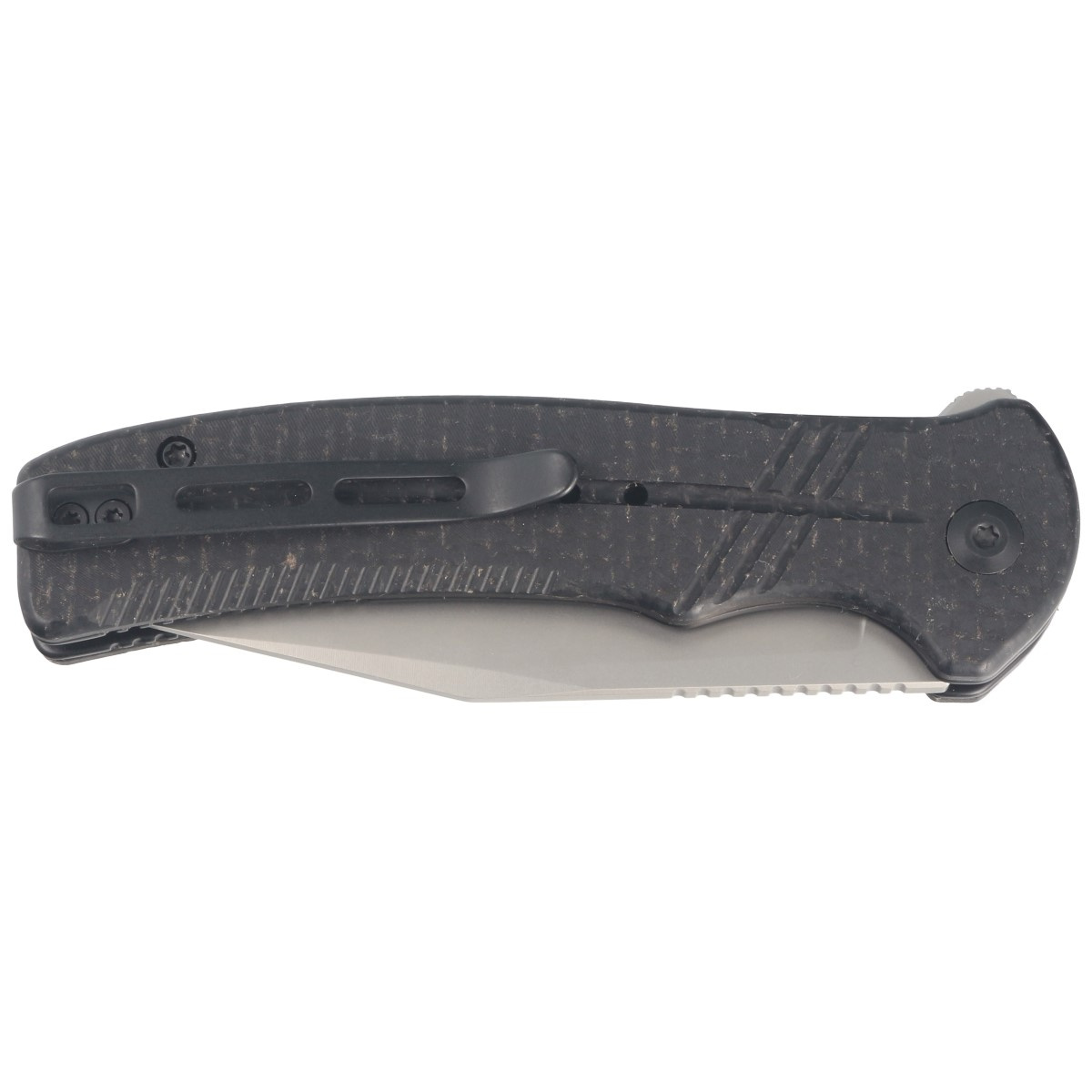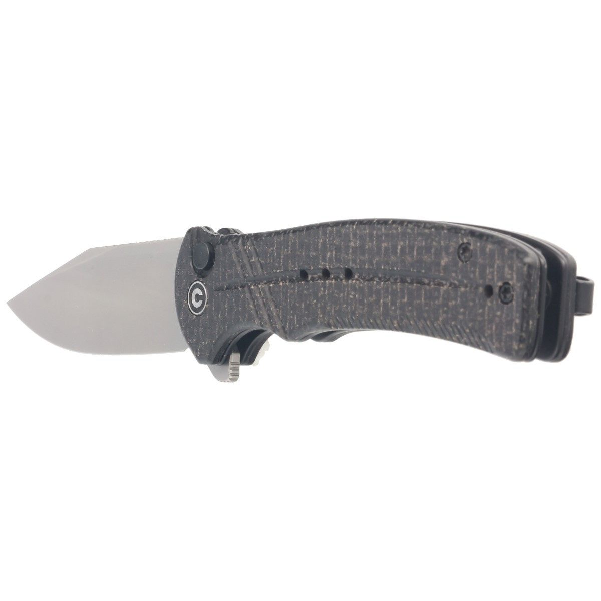 Handle - in black color. Made of micarta, a composite material of cotton or linen compressed with synthetic resin. Chamfered edges of the covers eliminate sharp edges for comfort, and jimping made on the front and back on the liners improves grip security. An open-backed design fixed with steel spacer sleeves reduces weight and facilitates cleaning. The pivot axle is decorated with a stylized Civivi brand logo. A two-position, right/left deep carry clip allows you to carry the knife discreetly in your pocket in tip-up position (blade tip up).