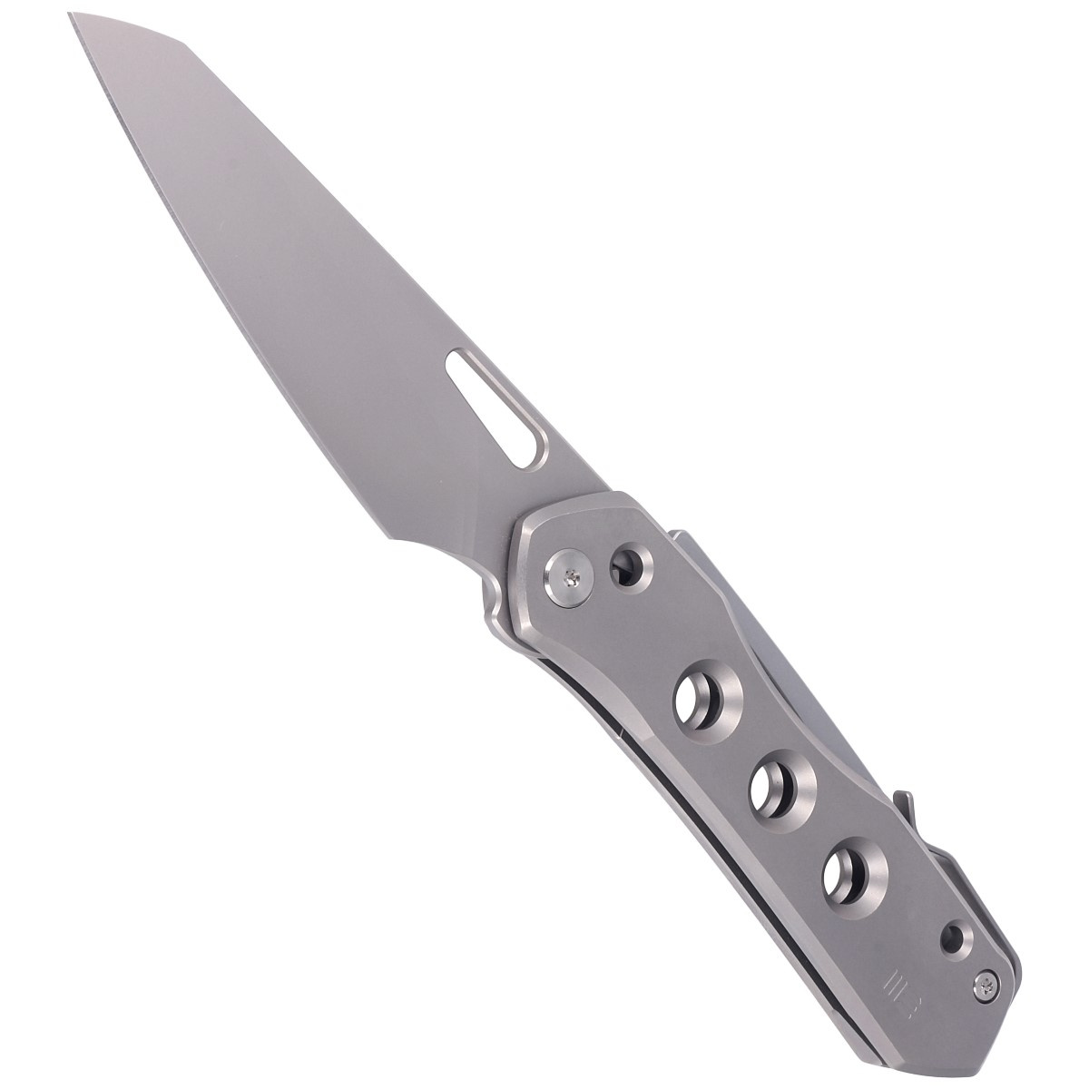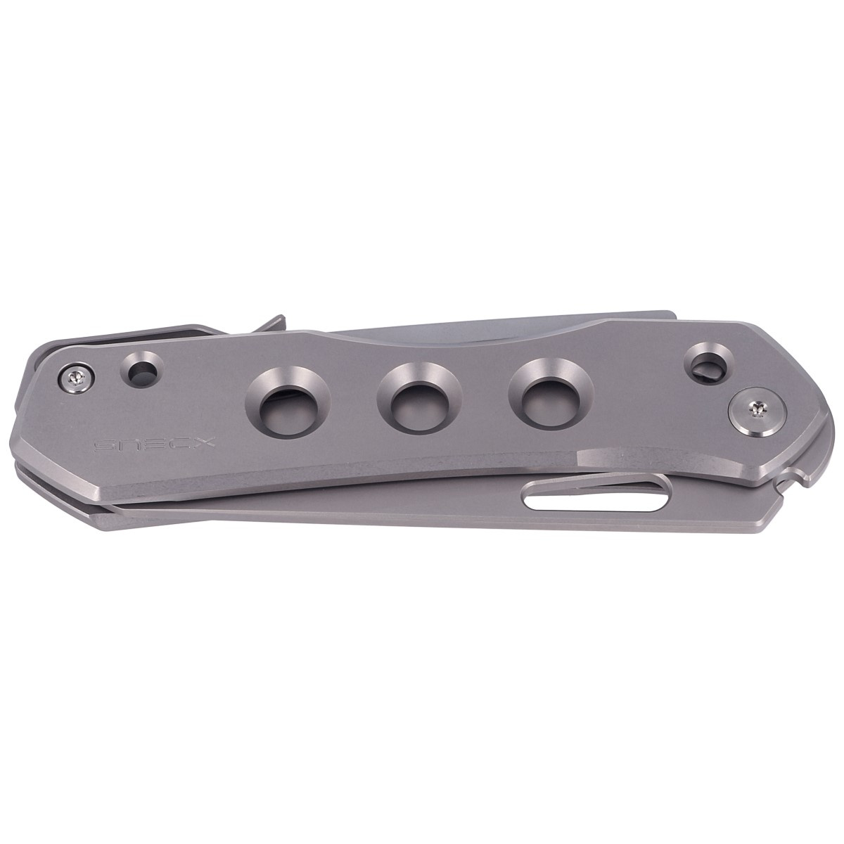 Handle - thick pieces of 6AL4V titanium, connected to each other by spacer tubes. The simplicity and robustness of the design give confidence in many years of use. The handle is relieved by a series of holes in the center of the facings. The two-position clip (top), made of titanium, allows the knife to be carried in tip-up position. Attention is drawn to its unusual placement, on top of the knife, rather than on the side as usual. A surprisingly convenient solution, allowing you to carry the knife on both the left and right side without using additional holes and rearranging the clip. In the back there is a hole for threading a safety or decorative cord. As in other models, the pivot is decorated with a stylized logo of the manufacturer.