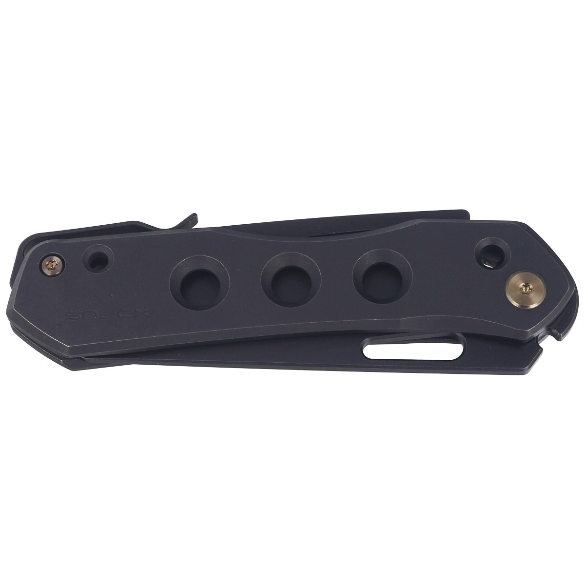 The handle - is thick pieces of 6AL4V titanium, connected to each other by spacer bushings. The simplicity and solidity of the design give confidence in many years of use. The handle was relieved by a series of holes in the center of the facings. The two-position clip (top), made of titanium, allows the knife to be carried in tip-up position. Attention is drawn to its unusual placement, on top of the knife, rather than on the side as usual. A surprisingly convenient solution, allowing you to carry the knife on both the left and right side without using additional holes and rearranging the clip. In the back there is a hole for threading a safety or decorative cord. As in other models, the pivot is decorated with a stylized logo of the manufacturer.