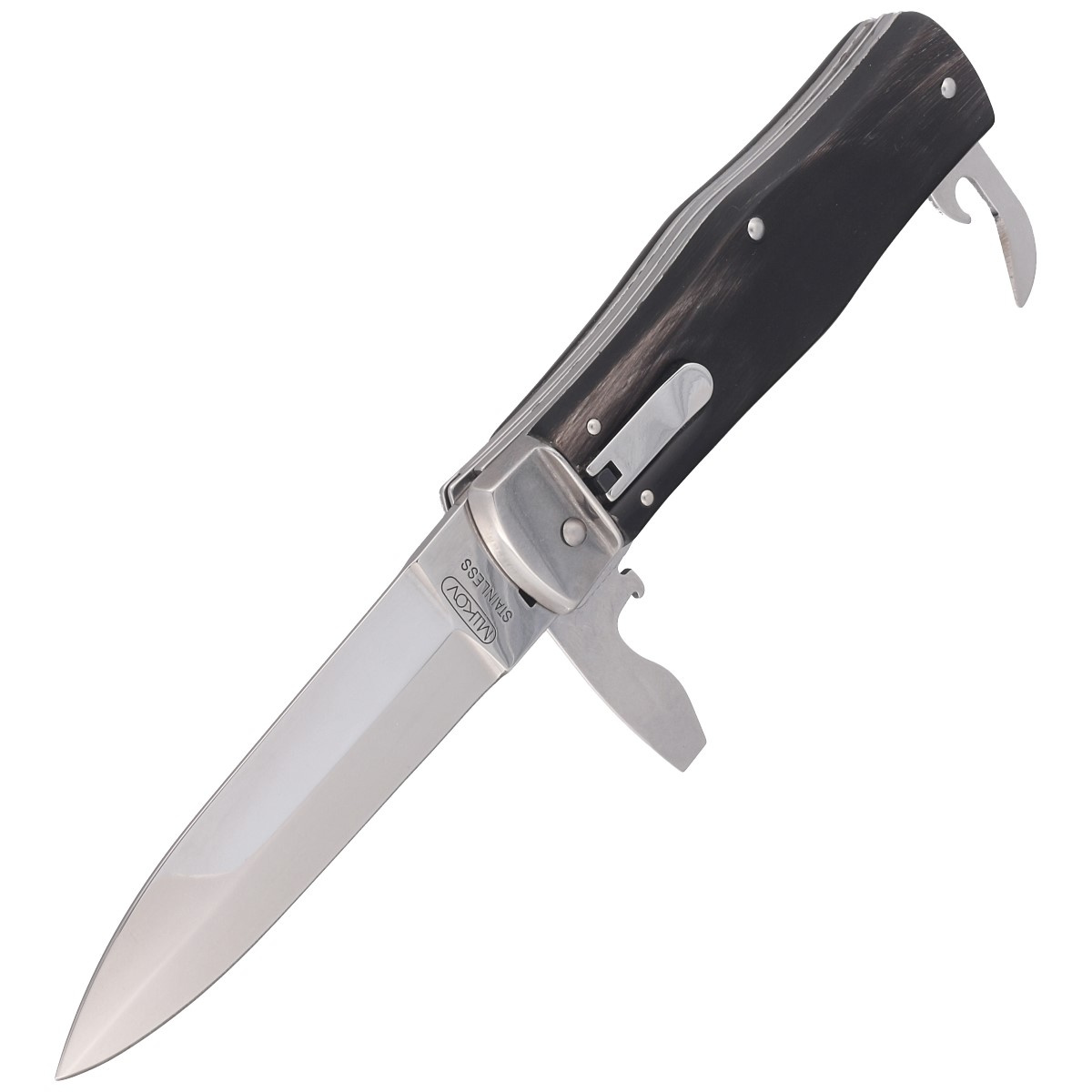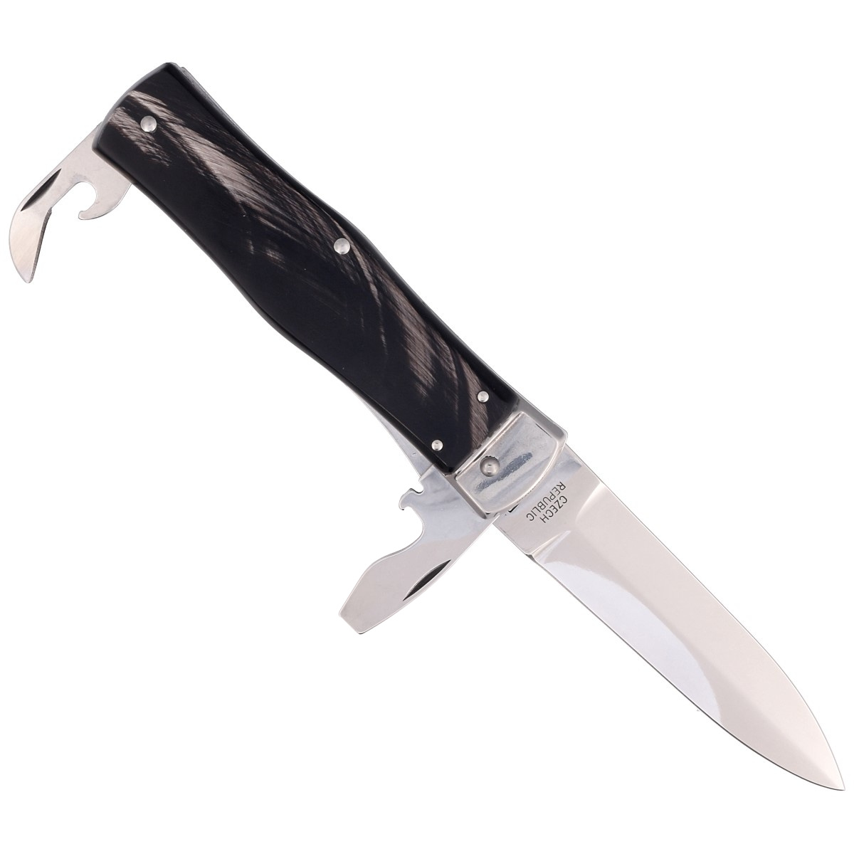 Predator Buffalo Horn, Mirror 3 blades, number of blades (3), number of tools (5). Automatic knife (switchblade) of the Czech company Mikov from Mikulasovice with three blades and buffalo horn linings. Mikulasovice is a region that has specialized in the production of knife products since 1794, being called the "Czech Solingen". The number of blades (3), the number of tools (5) makes the knife extremely functional.
