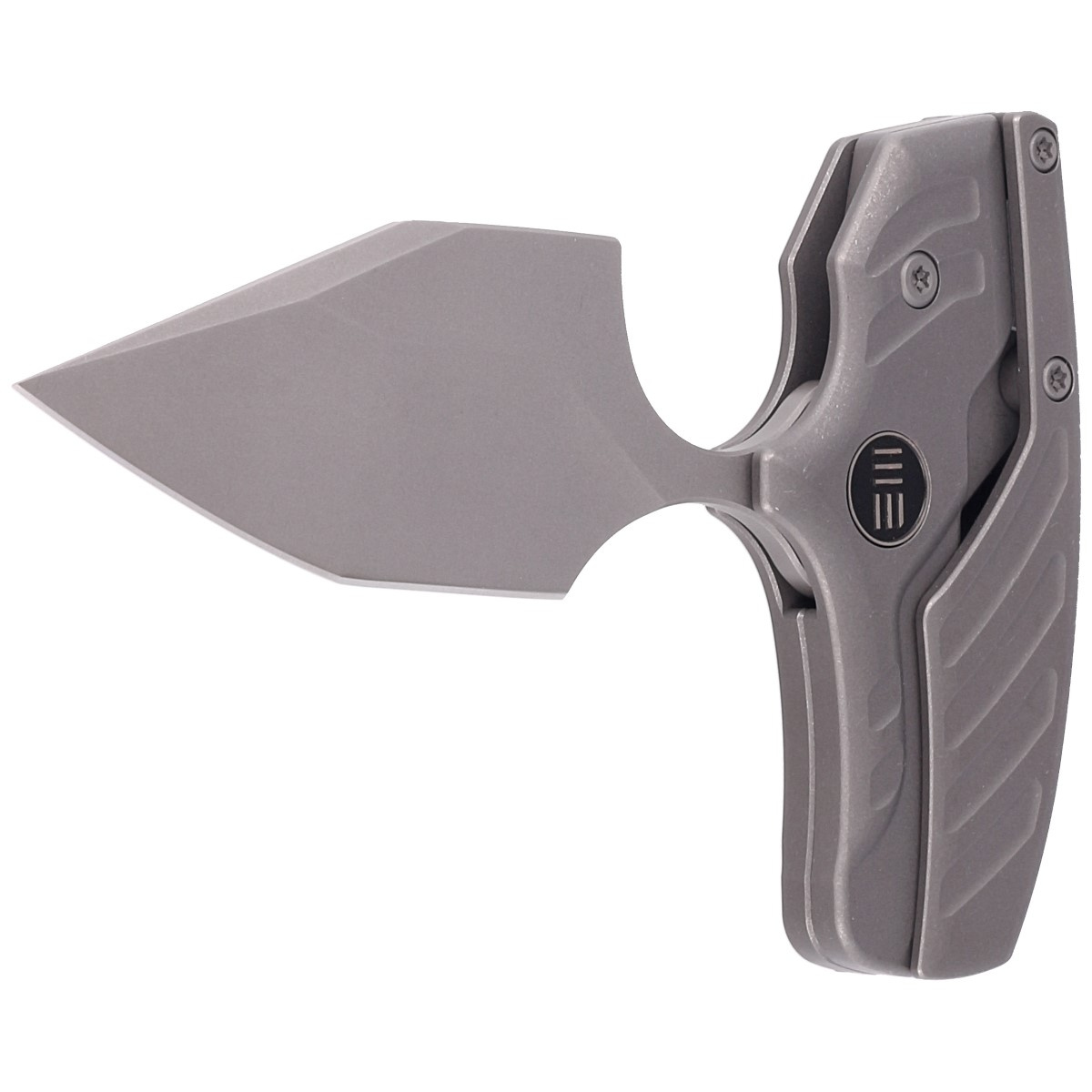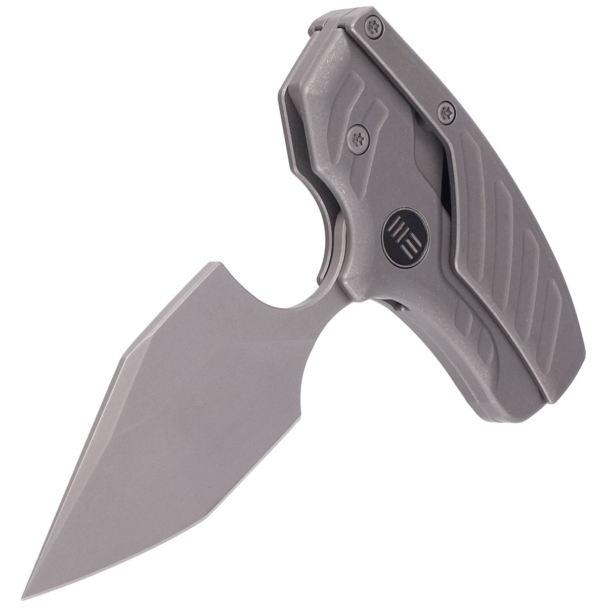 Handle - made of titanium 6AL4V, beveled edges of the covers eliminate sharp edges. Artful milling improves grip security. Sliding and pulling the handle apart allows you to quickly change the function of the knife. A fore finger groove improves grip confidence in the Fixed position, and in the Push Dagger position creates room for clenched fingers. The handle design is symmetrical which allows both right and left-handed people to use the knife without problems. The pivot is decorated with a stylized WE Knife brand logo.