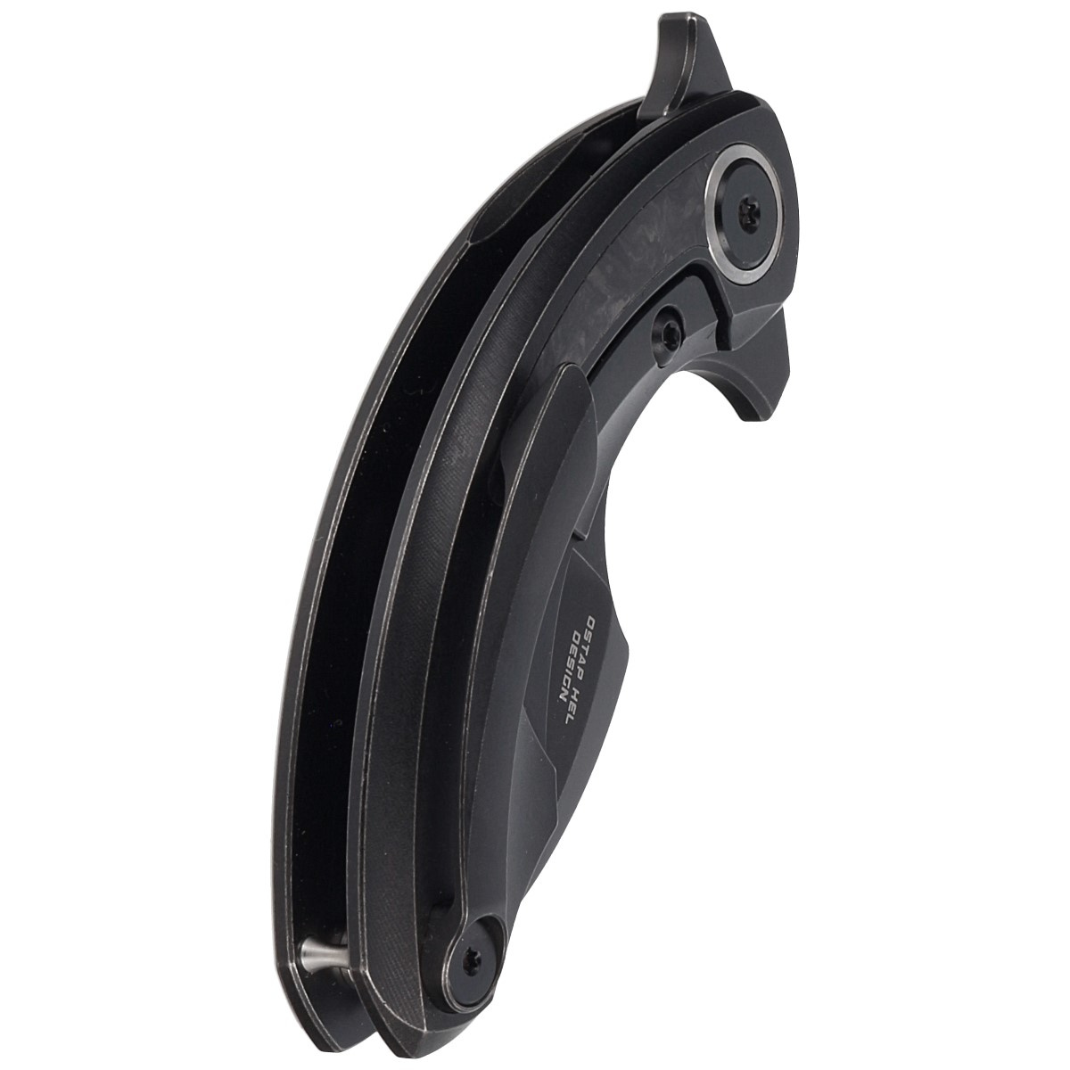 Handle - is two pieces of solid titanium 6AL4V with striking Marble Carbon Fiber inserts. The chamfered edges of the covers eliminate sharp edges for comfort, and the fore finger groove improves grip security. Open-backed design attached with spacer sleeves reduces weight and facilitates cleaning. A single-position, right-handed titanium clip allows the knife to be carried in the tip-up position, with the tip of the blade upward.