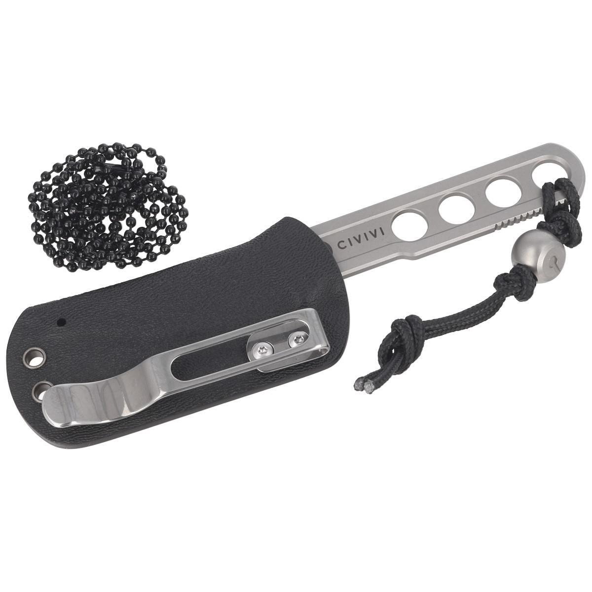 Sheath - made of kydex, which thanks to a clip mounted to it can be attached to a belt or the edge of a pocket. We can also wear the knife around the neck using the included chain.