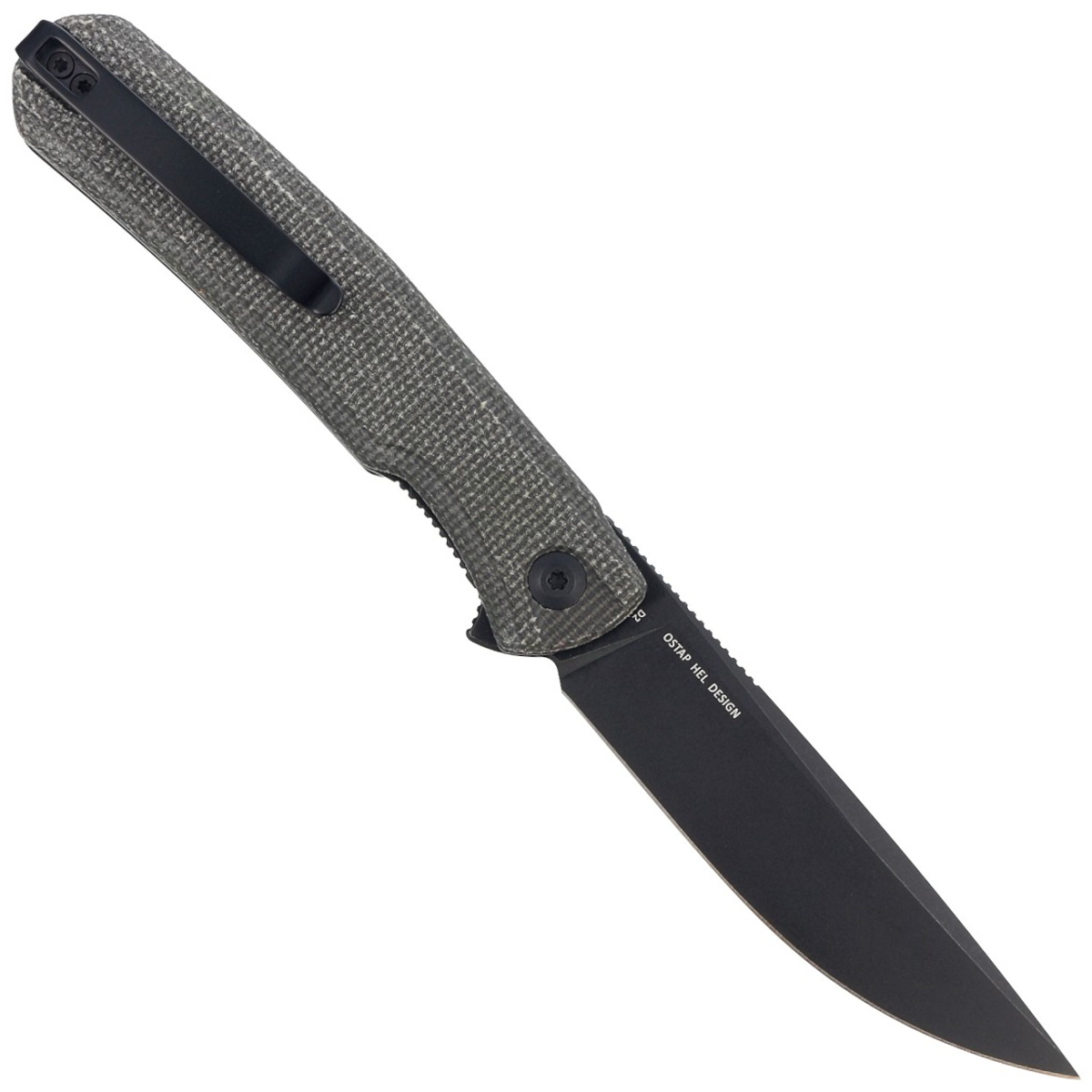 Handle - made of Micarta, a composite material of pressure-pressed canvas with synthetic resin. The aggressive texture of the lining provides a secure grip, even with wet hands. The cover's chamfered edges eliminate sharp edges for comfort, and the jimping made in the front on the liners improves ergonomics. An open-backed design fixed with steel spacer sleeves reduces weight and makes cleaning easier. A two-position right/left deep carry clip allows you to carry the knife discreetly in your pocket in tip-up position (blade tip up).