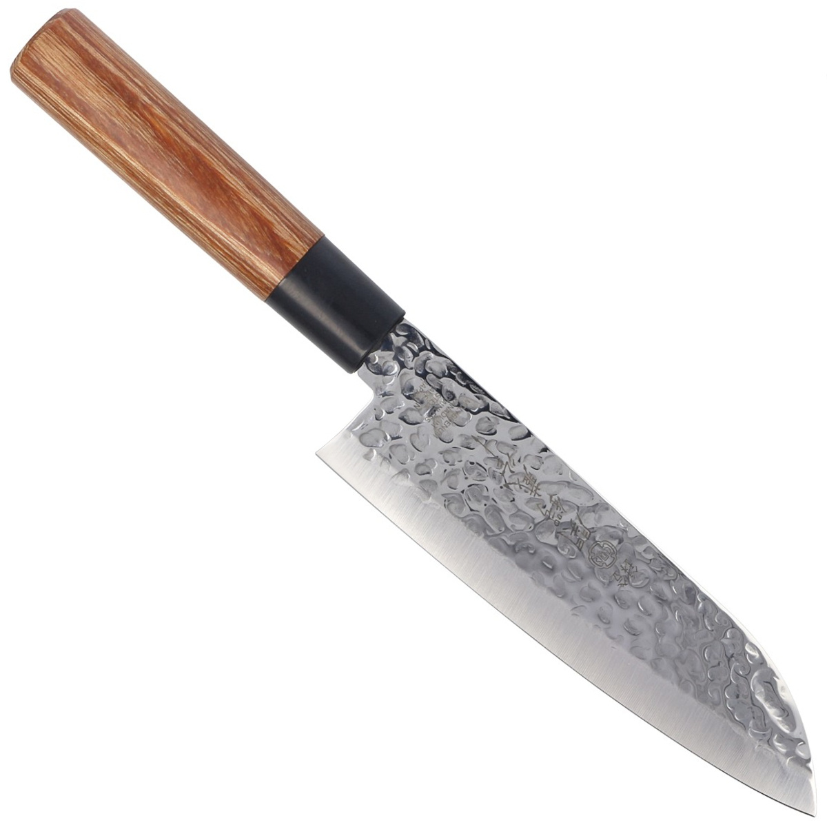 - Tsubazo Santoku Pakka Wood, Tsuchime in Daido 1K6j stainless steel. Made with the same methods as samurai swords, with a comfortable round handle made of pakka wood, the blade finished with a striking hammering method - tsuchime. Note!!! Very sharp!!!