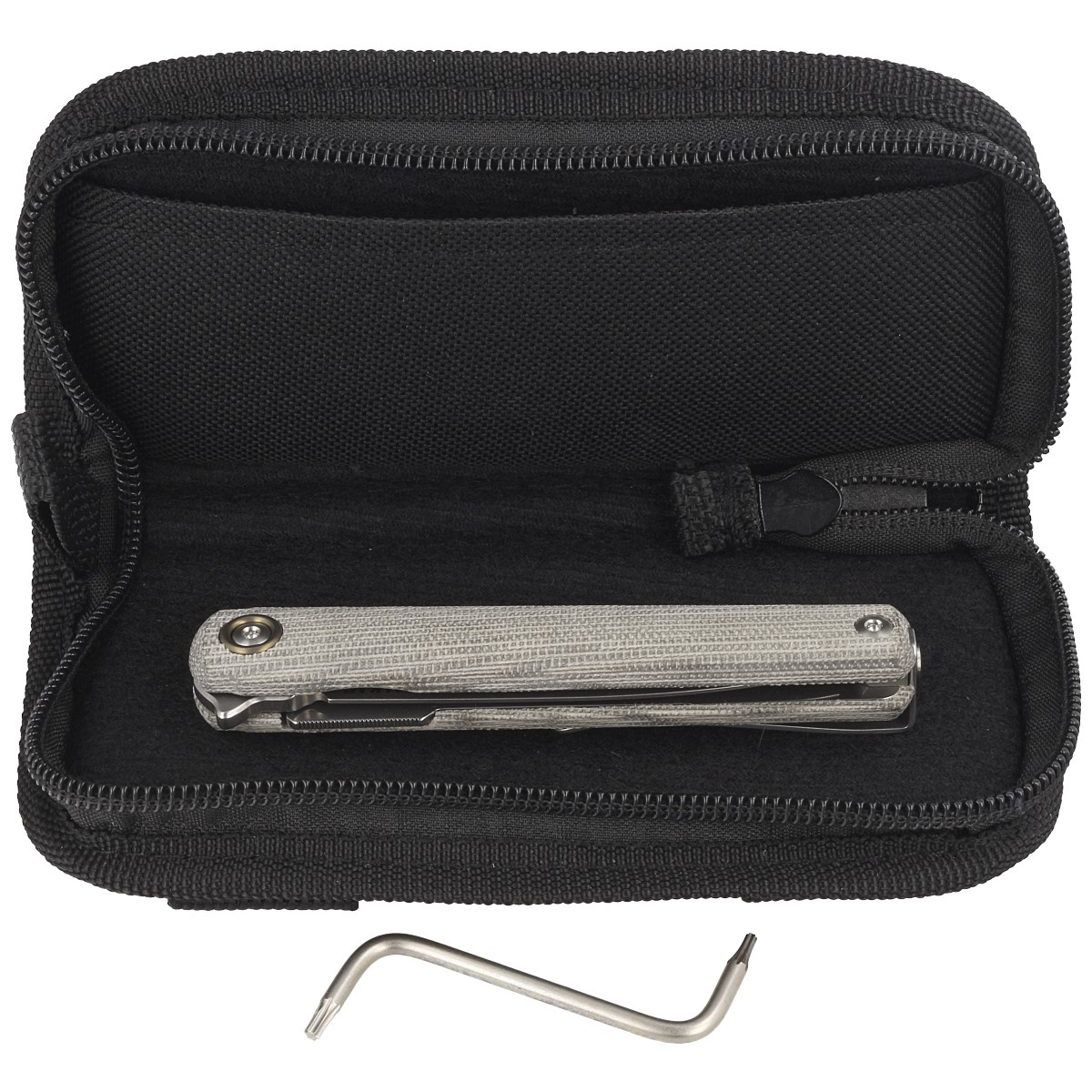 Handle - made of Canvas Micarta, a material that combines low weight with high wear and weather resistance. The slightly textured surface increases grip, even in humid environments. Construction based on steel liners bolted together using a spacer sleeve provides rigidity with minimal weight. A double-sided deep carry clip allows the folder to be carried discreetly in a pocket by both right- and left-handed users. A subtle anodized ring detail around the pivot adds a distinctive touch to the design. The folder comes in a soft Cordura case with zipper and belt-tie option - ideal for safe carrying or storage. T6/T8 torx keys are also included.
