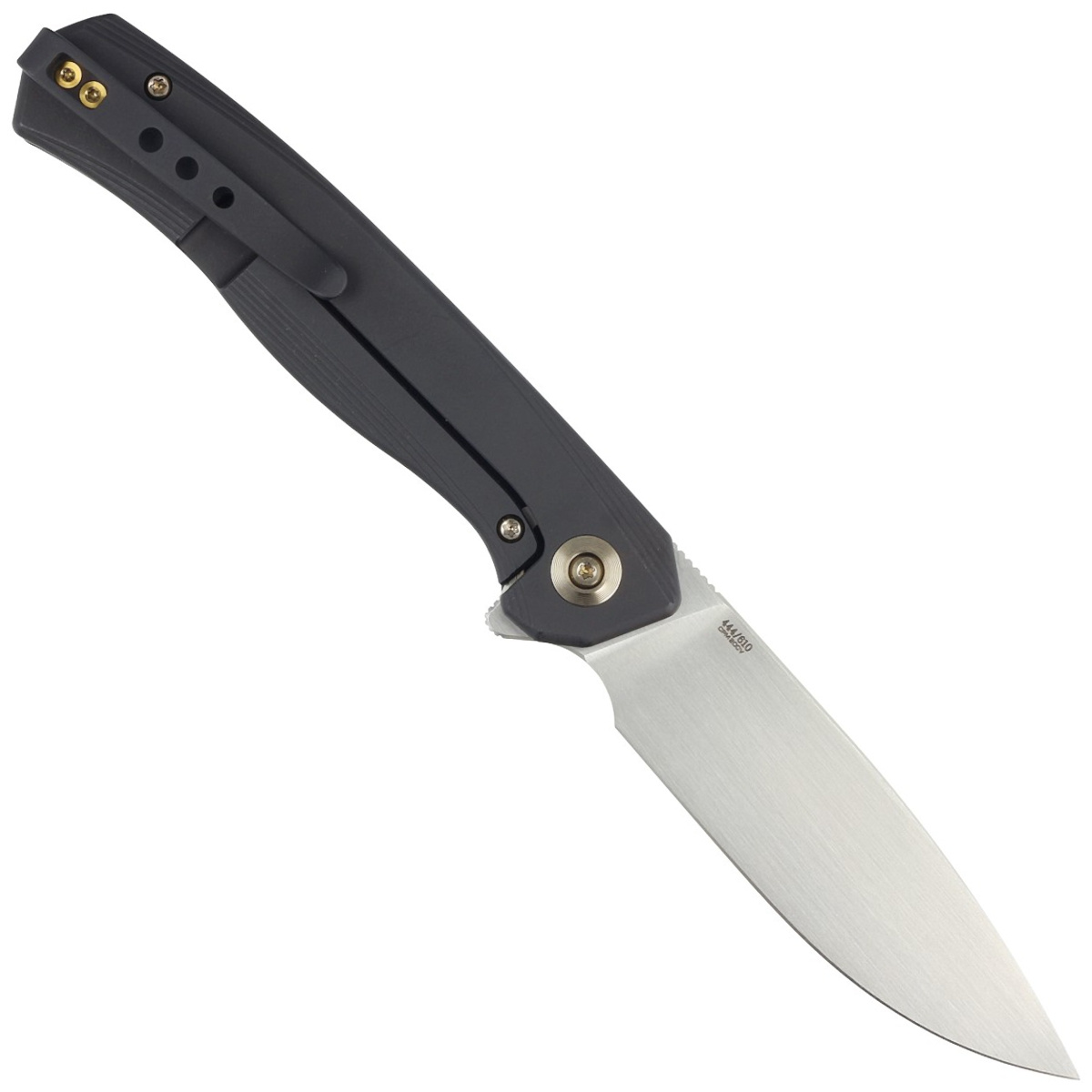 Blade - drop point type. For easier sharpening, the beginning of the cutting edge starts with a small choil. The applied flat grind gives us cutting properties almost on the level of a razor. On the back we find perfectly made "jimping", notches on which we can put our finger to improve grip and control over the knife during use. The blade was finished with "hand rubbed satin" method. Opens with a flipper so it can be used by left and right-handed people without any problems. Ceramic ball bearings ensure smooth operation of the opening mechanism. The entire mechanism is locked with a proven and popular frame lock with a steel insert protecting against wiping the lock face.