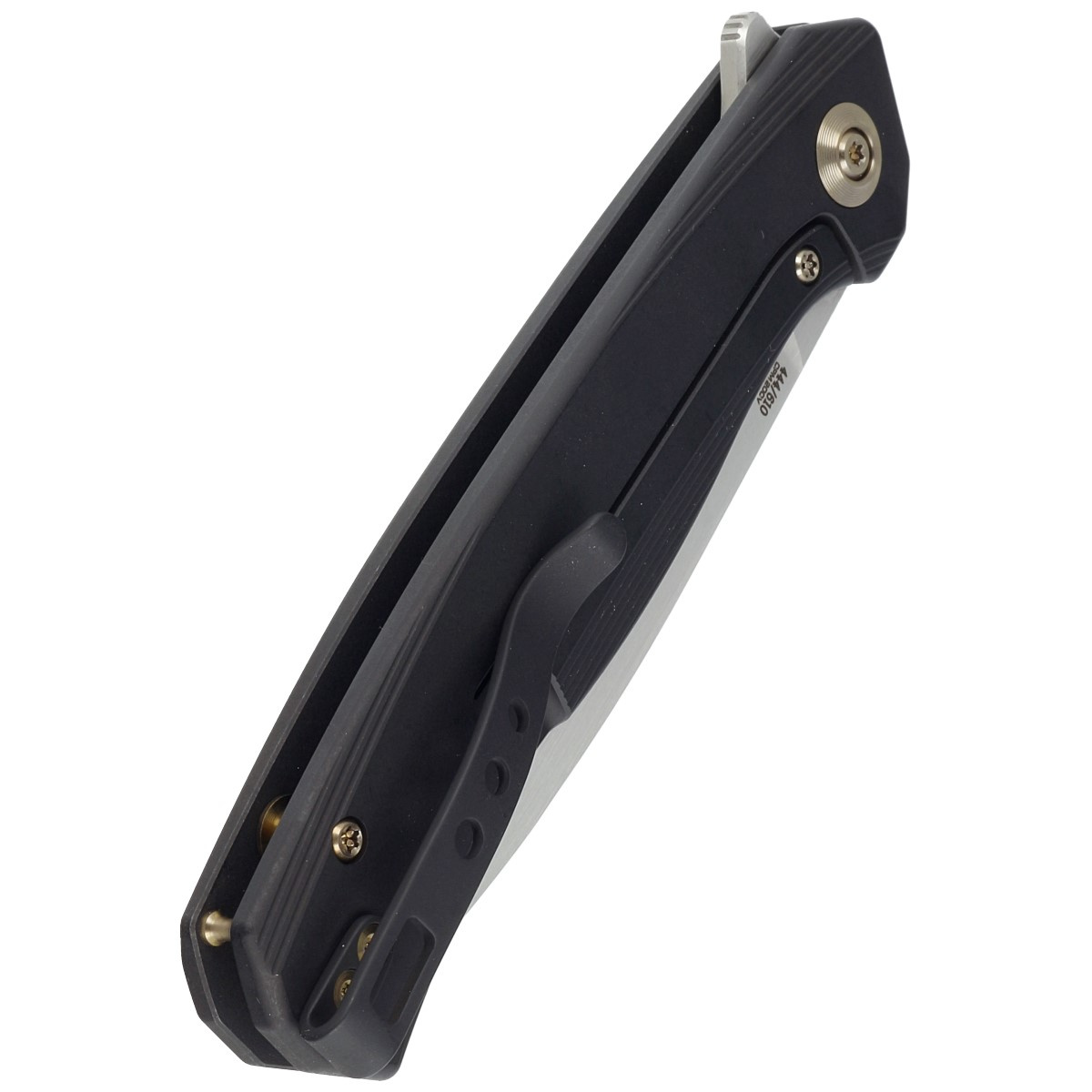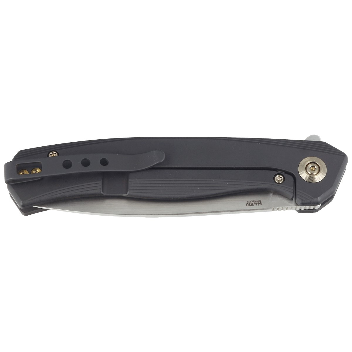 Handle - made of solid 6AL4V titanium anodized in black finished with stonewashed method. Both facings were screwed together creating a simple and solid construction. A two-position (right/left) titanium deep carry clip allows the knife to be carried in tip-up position. The back of the handle has a place to thread a safety or decorative cord around one of the spacer sleeves. As in other models, the pivot is decorated with a stylized logo of the manufacturer.