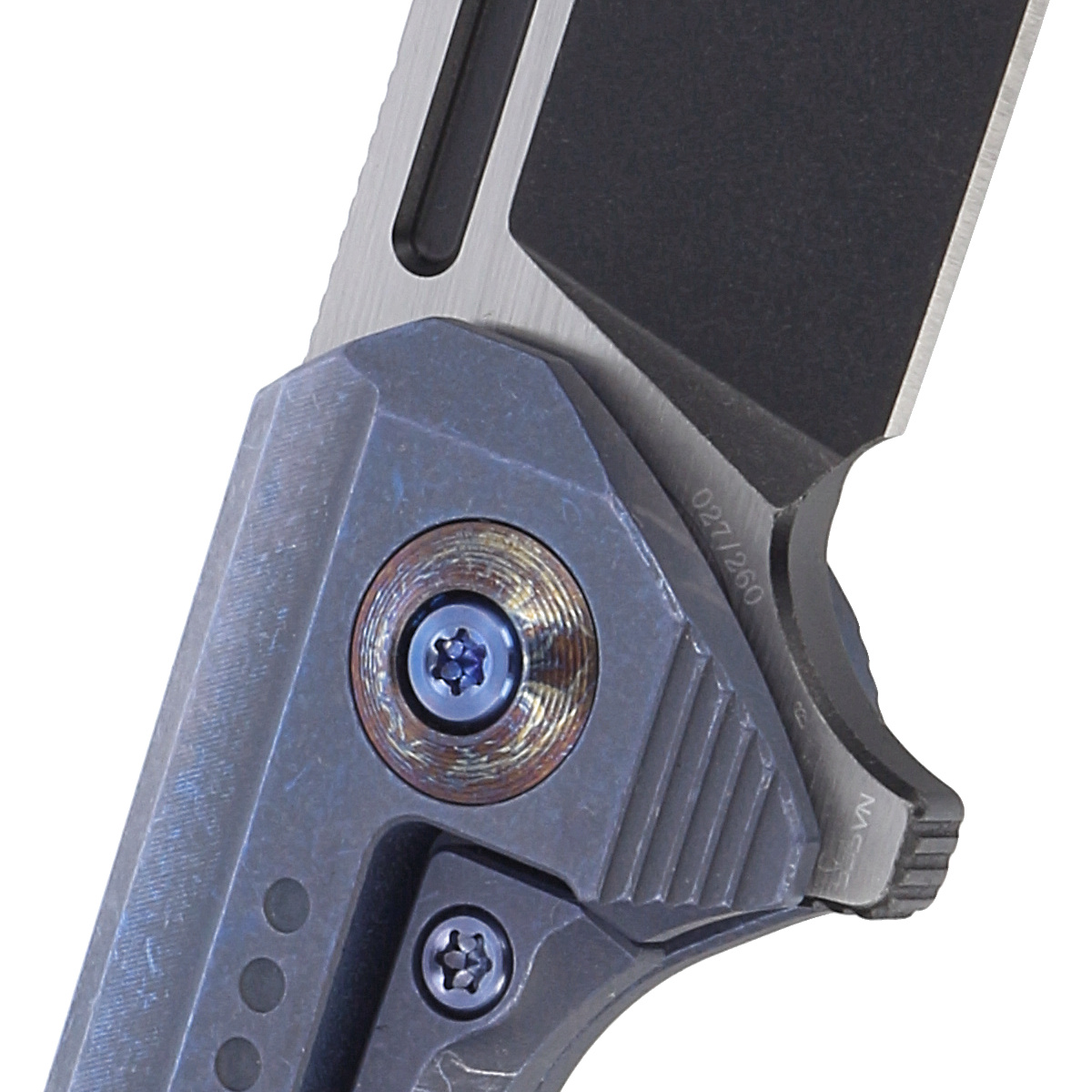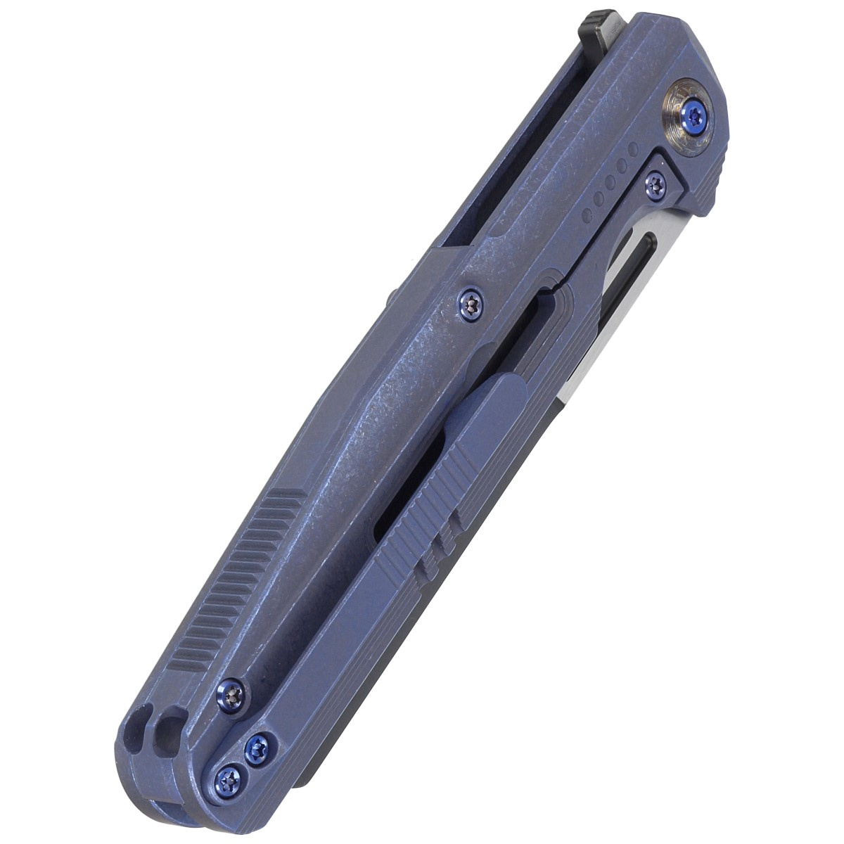 The handle - is a thick piece of titanium 6AL4V, beautifully milled in geometric patterns. Only a few companies are able to make the handle with such incredible accuracy! Joined together using a titanium backspacer. The simplicity and solidity of the construction give the assurance of many years of use. The single-position clip (right), made of titanium, allows the knife to be carried in tip-up position. As in other models, the pivot axis is decorated with a stylized logo of the manufacturer.