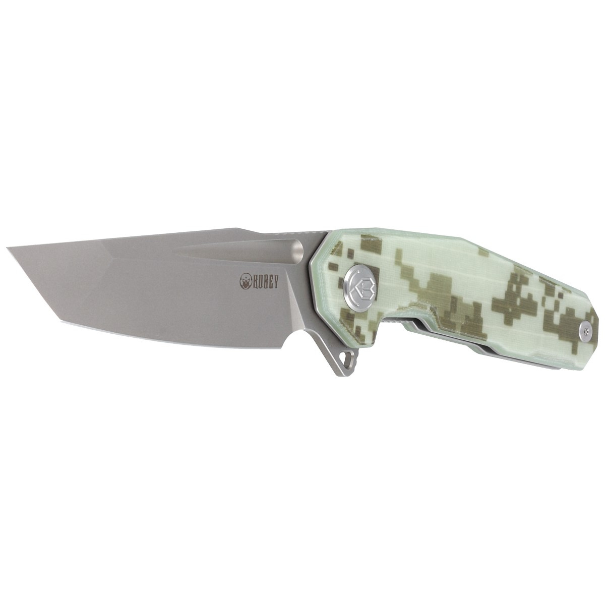 Handle – scales in a pixelated, military digital camouflage pattern. Made of G10 composite (fiberglass pressed under pressure with synthetic resin), textured for improved grip, and fastened to the knife’s steel frame. The open-backed construction, fastened with steel standoffs, reduces weight and facilitates easy cleaning. This simple yet robust design ensures years of reliable use. A deep, contoured fore finger groove improves grip confidence, while the pivot axle is adorned with the stylized Kubey Knife logo. The knife features a single-position, right-side metal deep-carry clip, allowing for discreet pocket carry in a tip-up position.