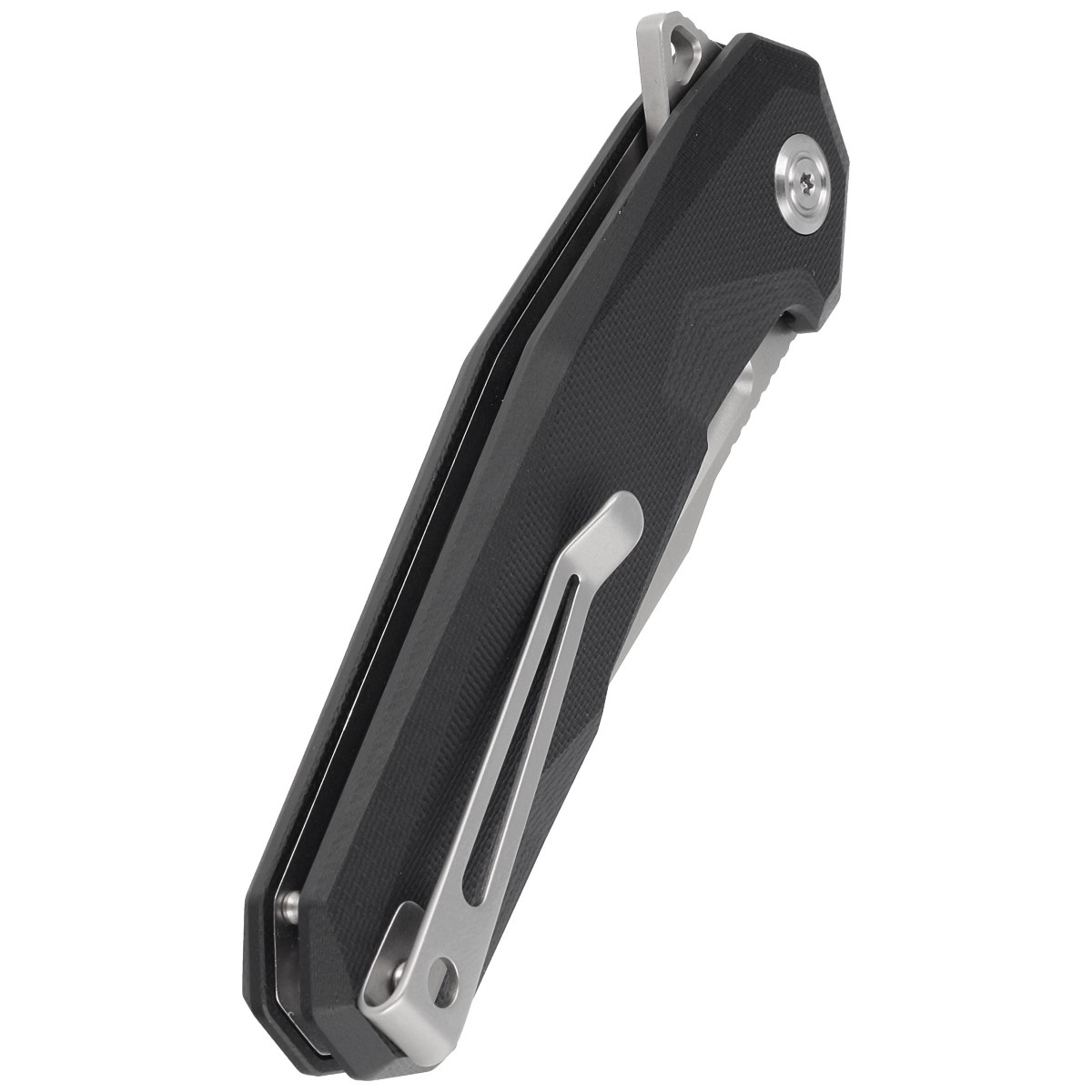 Blade - with a modern Tanto profile, with reinforced tip. Finished with a scratch-concealing Bead Blasted method, which involves abrasive blasting with fine glass or ceramic beads. The long cutting edge in relation to the length of the blade converges with a geometric belly towards the needle-sharp tip of the knife. The thickness of the blade provides high strength while the high, flat grind guarantees excellent cutting properties. Ceramic ball bearings are responsible for the smooth and smooth operation of the blade advancement mechanism. When opened, the flipper fin forms a mini-guard preventing the hand from slipping on the blade. On the back of the upper jimping wedge, a notched thumb rest. The deep choil makes the knife easier to grip for precision work. Liner-Lock mechanism.