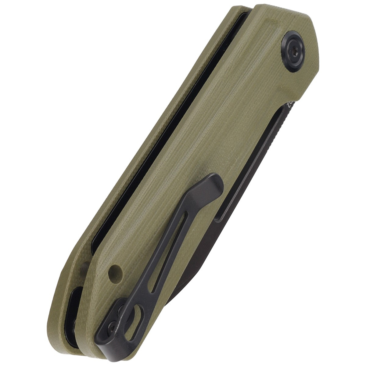 Handle - grips made of G10 composite, a virtually indestructible plastic, insensitive to weather, resistant to chemicals and mechanical damage. Textured for improved grip confidence, screwed to the knife's steel frame. The so-called open-backed design without the typical backspacer, fastened together with steel spacer sleeves for easy cleaning. The simple, sturdy design gives assurance of many years of use. Ergonomic finger recess for easy grip on the Handle. Pivot decorated with stylized manufacturer's logo. Two-position (right/left) steel deep carry clip allows you to carry the knife discreetly in your pocket in tip-up position (blade tip up). Above the clip a lanyard hole, a hole for threading a cord.