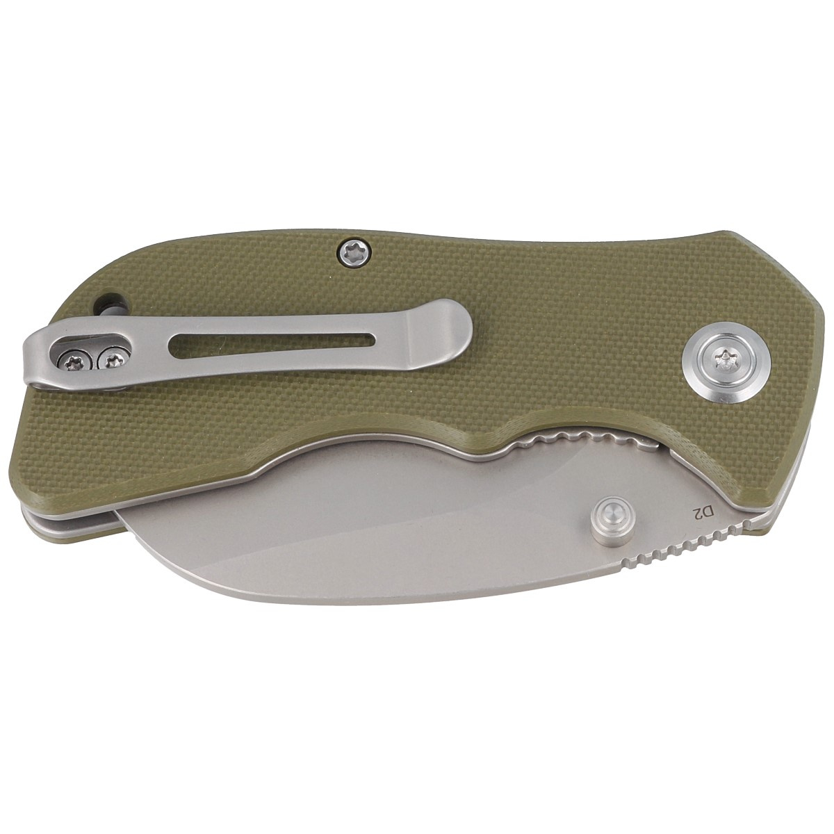 Karaji Green G10, Bead Blasted, compact EDC folder, small in size, yet built like a tank! D2 blade tool steel, rugged G10 plastic on the Handle, a tool that you can always carry with you and that will not fail! Bestseller!