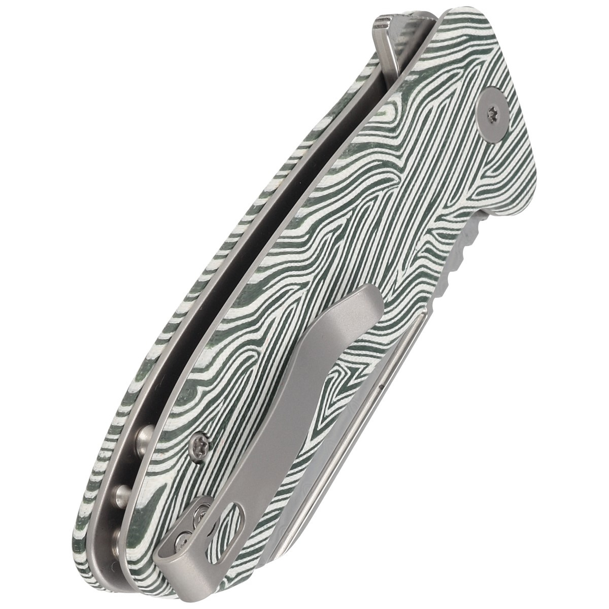 Handle - G10 (pressure-pressed fiberglass with synthetic resin) with a unique two-tone design. Textured for improved grip confidence, bolted to the knife's steel frame. The so-called open-backed design without the typical backspacer, fastened together with steel spacers for easy cleaning. The simple, sturdy design gives assurance of many years of use. A deep finger undercut (fore finger groove) improves grip security. The pivot axis is decorated with a stylized manufacturer's logo. A two-position (right/left) steel deep carry clip allows you to carry the knife discreetly in your pocket in tip-up position (blade tip up).