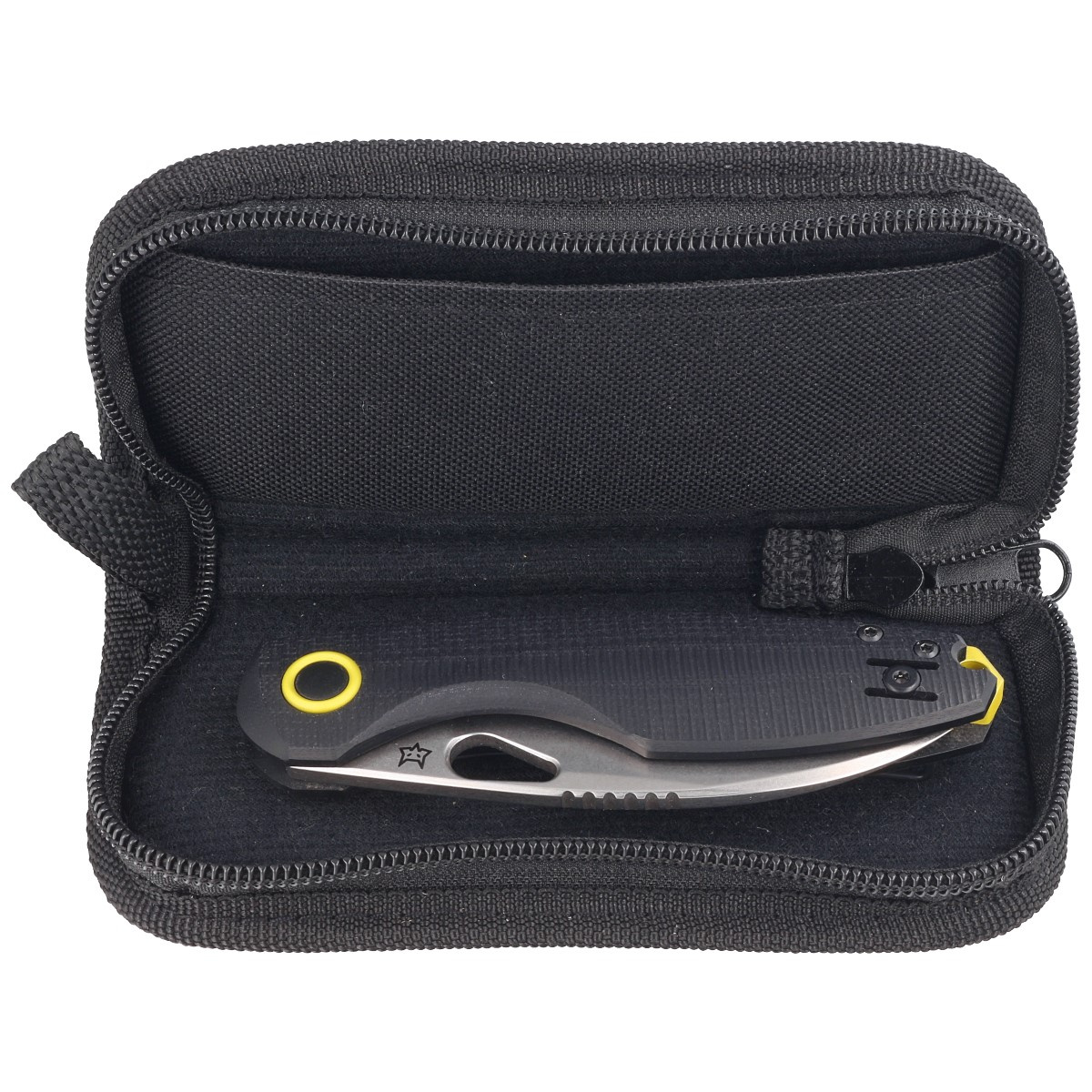 Handle - G10 (fiberglass compressed with synthetic resin) facings insensitive to weather conditions, resistant to mechanical damage. Chamfered edges of the covers eliminate sharp edges for comfortable grip. The yellow oxidized backspacer provides rigidity and solidity to the whole structure. The same color is used for the decorative overlay around the pivot. A two-position (right/left) lightweight wire clip allows the knife to be carried in the tip-up position, with the tip of the blade upward. Above the clip a hole for threading a safety or decorative cord.