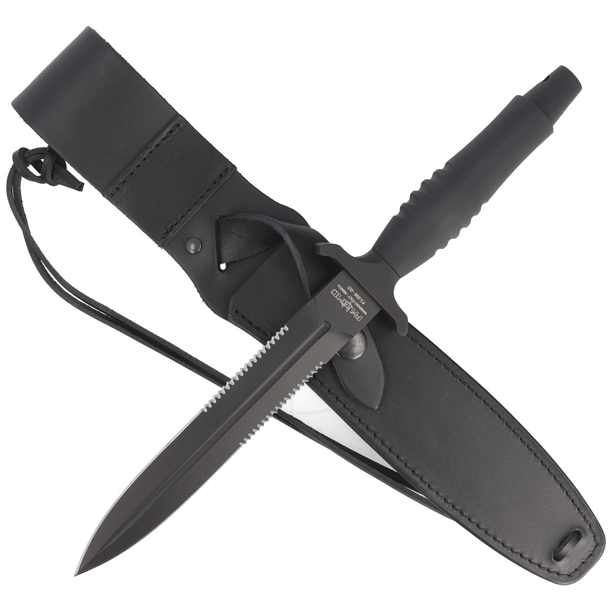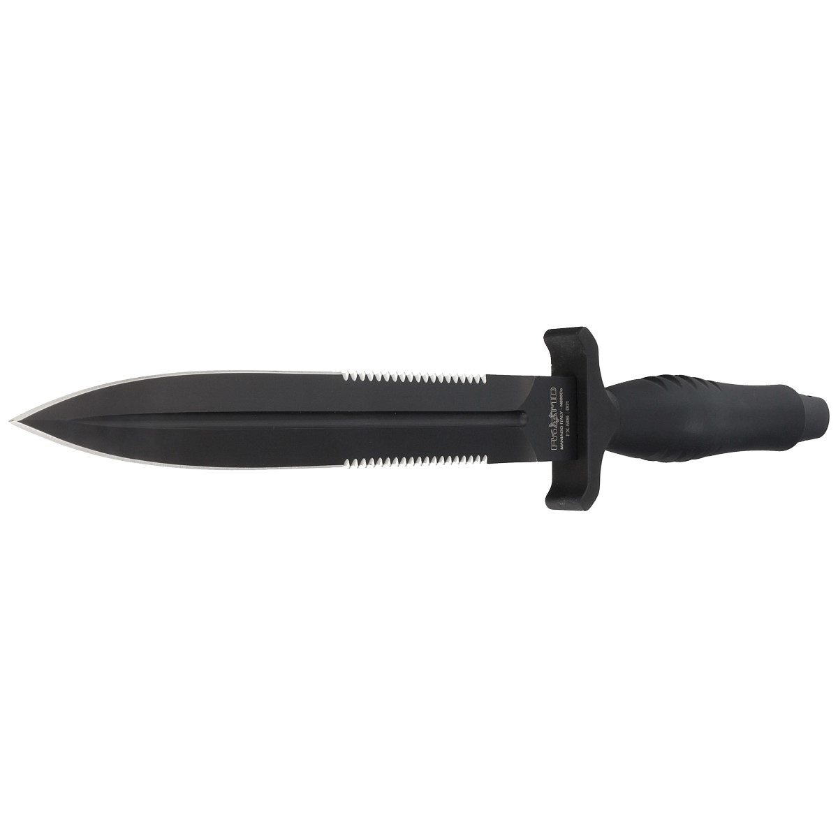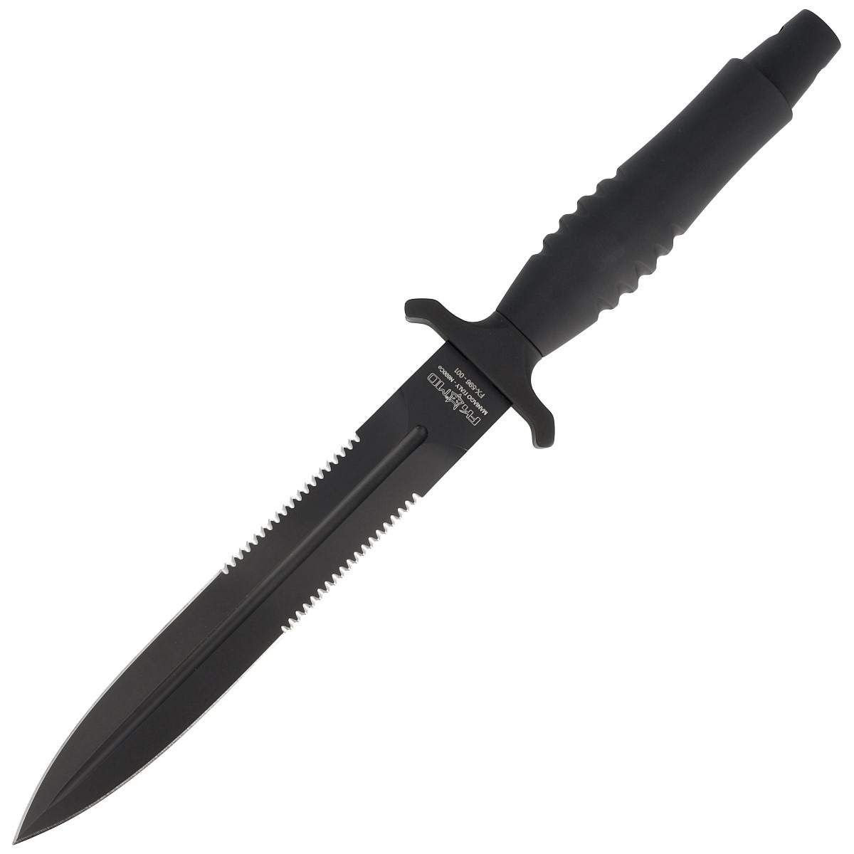 Blade - extremely slender with a Dagger shape with a double-edged symmetrical blade. The blade was coated with a black, non-reflective Top Shield® coating. The blade was derived with a Flat grind for excellent cutting and especially penetration properties. On both sides closer to the Handle a sawtooth blade with fine serrations. At the base of the Blade double finger guard double-sided hilt to protect the hand from slipping on the blade.