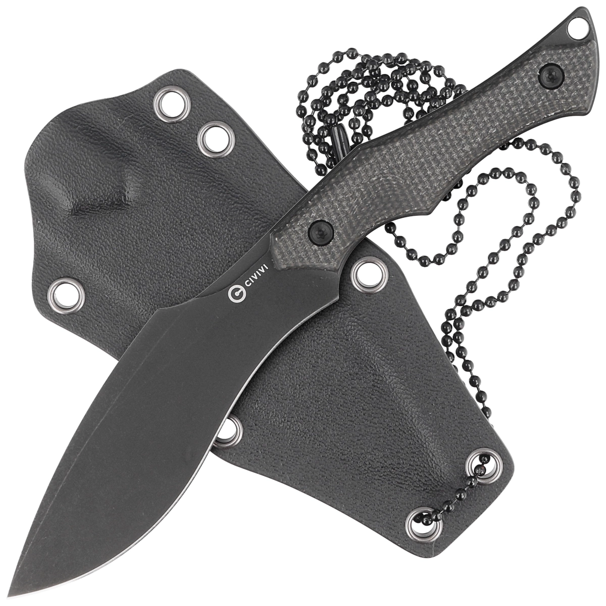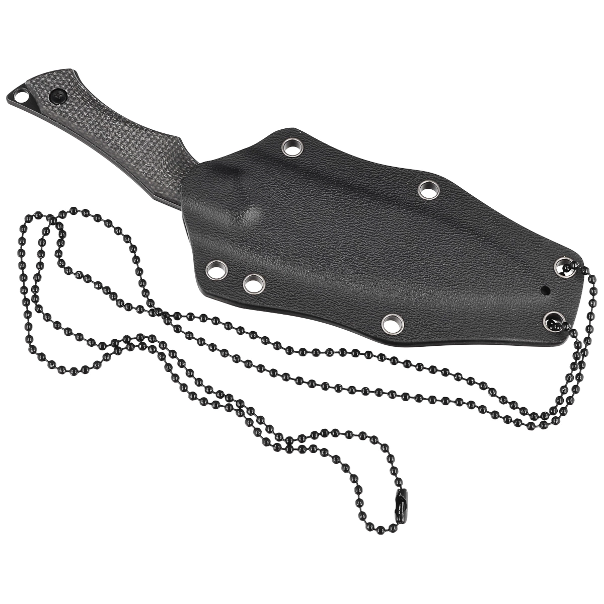Sheath - made of kydex, extended, protecting the Blade along with part of the Handle. A set of holes on the edges provides multiple trouncing options. Complete with a ball chain for hanging the knife around the neck.